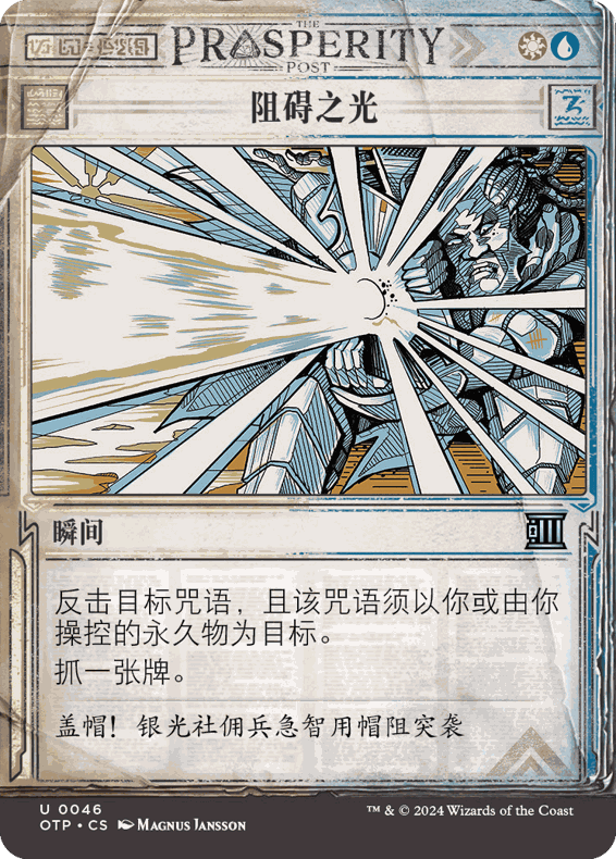 A:不能,你在本例中无法施放阻碍之光。破颅假想(咒语本身)没有目标。它有一个会在施放者选择弃一张非地牌时触发的自身触发异能,但那是一个独立的异能,取你的生物为目标的并非咒语本身。因为阻碍之光的目标只能是咒语,不能是异能,所以它不能取该自身触发异能为目标,你无法阻止该异能对你的生物造成4点伤害。