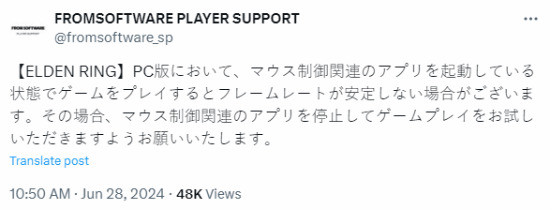 据报道,FS社的这条建议可能参考了玩家的反馈。本周早些时候,有玩家发文称:“自从《艾尔登法环》补丁发布以来,卡顿一直存在,问题原因已经查明。似乎出于某种原因,游戏与我经常使用的鼠标应用程序Kazaguru Mouse不兼容。我暂时关闭了它,问题就解决了。”
