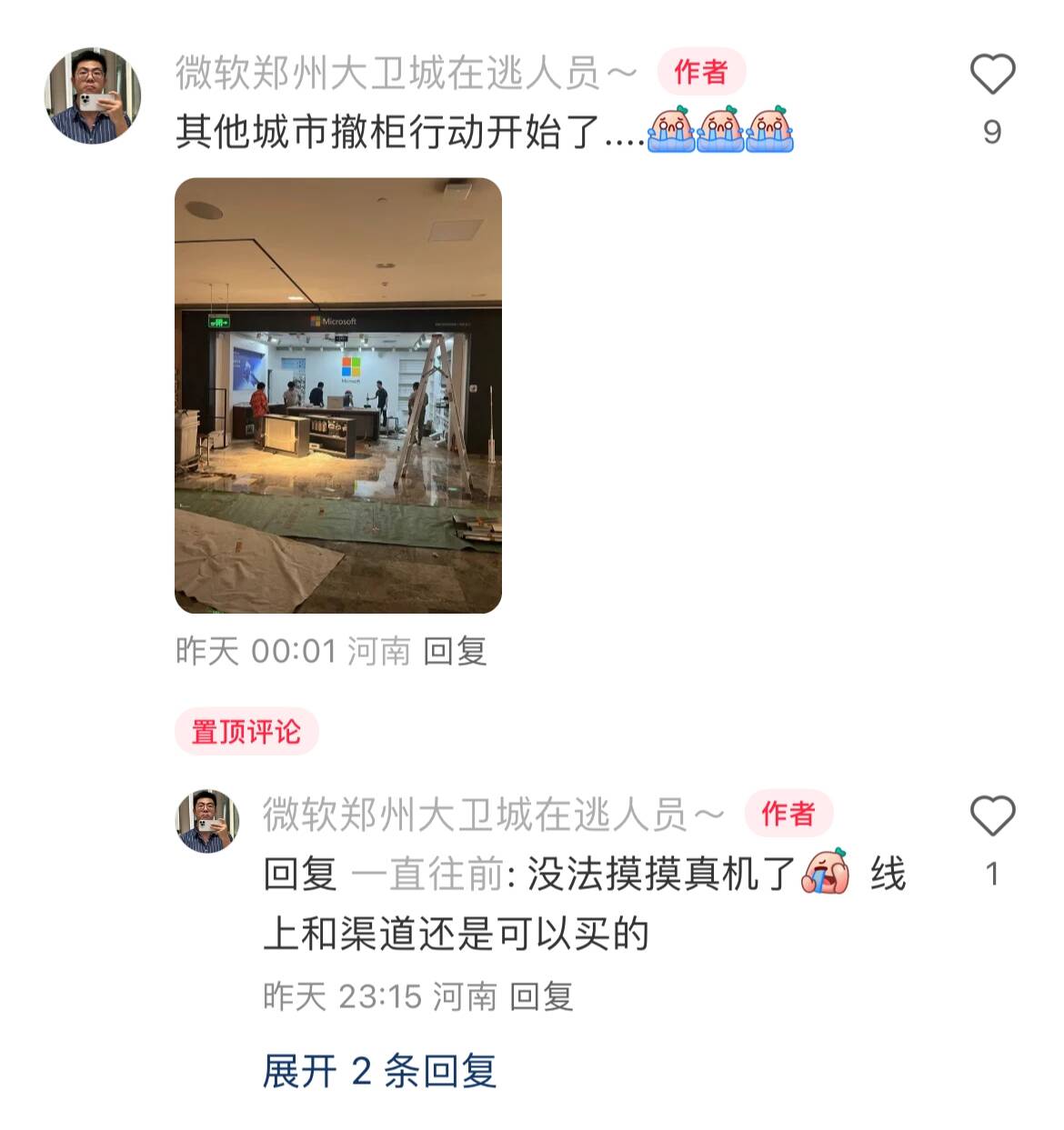 同时,小红书博主“微软郑州大卫城在逃人员”也发帖提到“微软关闭中国线下授权门店”一事,该博主账号资料显示微软大卫城店店长。