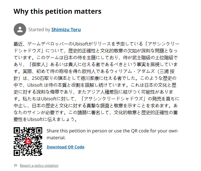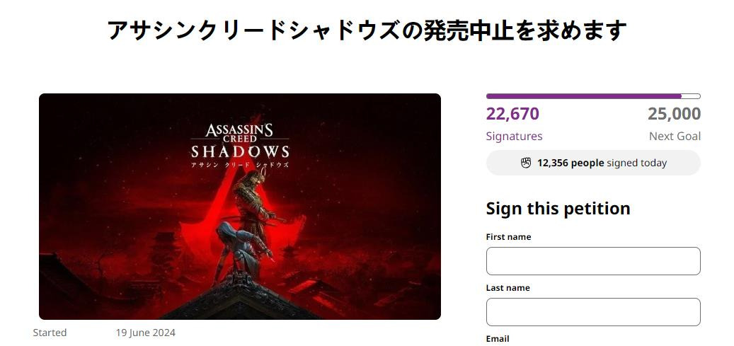 近日有名为“Shimizu Toru”在请愿网站“Change.org”上发起了要求育碧取消《刺客信条:影》发售的请愿,目前已经获得了超过2万人的联名支持。