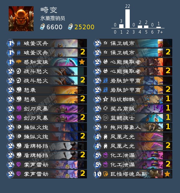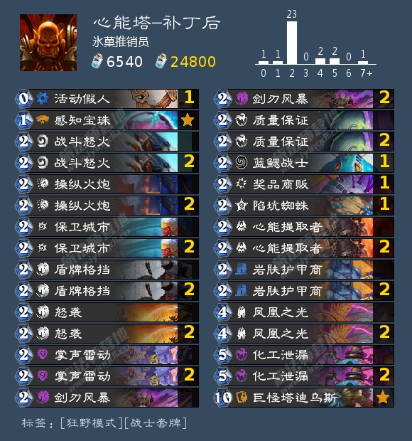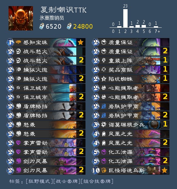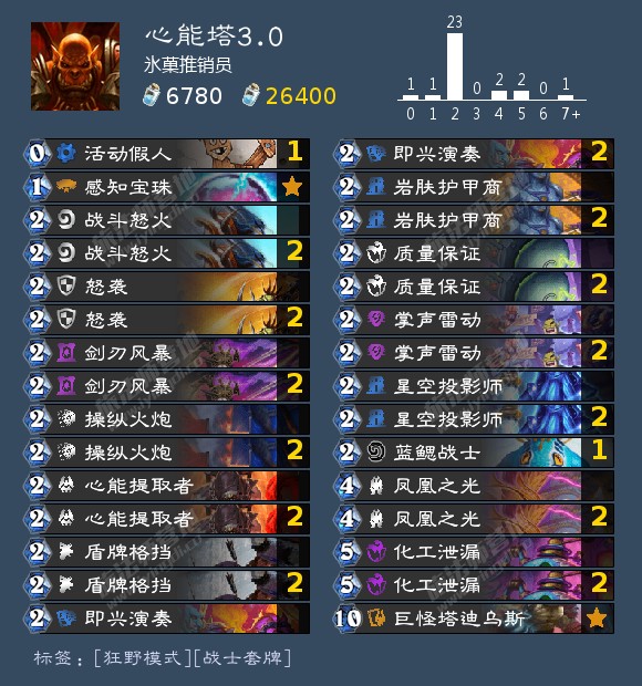 再有就是畸变活动的上线,部分畸变buff对心能塔极为不利,心能提取者被减1费这局就算是有了。但也可针对部分畸变也可对卡组进行一波调整,利用部分畸变的效果。这里笔者针对会出现的【机遇来临】(每回合抽到的第一张是有法力值能打出的)选择放弃抽二嘲讽的质量保证和相配合的活动假人,改用破釜沉舟来检索塔,提高组件的上手率。破釜沉舟配合其他畸变也能达到保护组件放破坏、顺滑节奏防爆牌等作用。