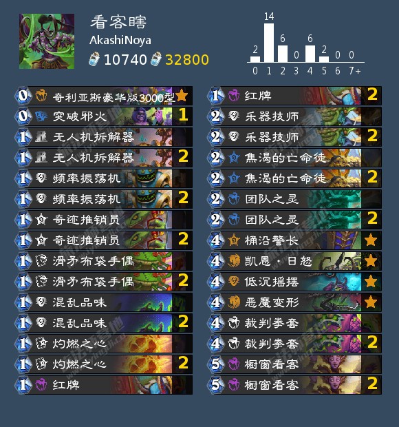 还有比较极端的赢法就是靠好的畸变buff或者频率振荡机在两三费快速拍出奇利亚斯(失控加能量)站场,赌对面没有好的应对方式一两波结束掉比赛。一般这么打现在绝大多数职业都有应对方法,最好手上还捏着凯恩、红牌或者还有一波刀+看客的后续,不然这种打法很容易炸。