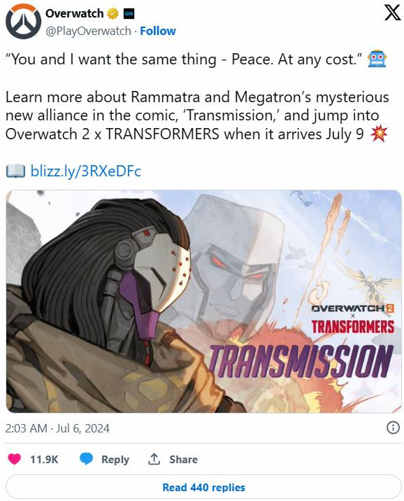 《守望先锋2》将于北京时间7月10日推出与《变形金刚》联动活动。根据游戏官宣的宣传图和相关漫画,或许可以揭晓即将在《守望先锋》中亮相的变形金刚角色。