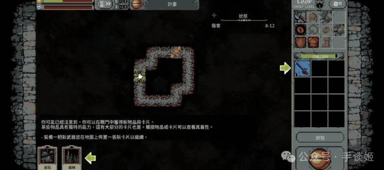 战胜敌人后会掉落卡牌和装备,而玩家可以把卡牌打出在地图上,产生相应的效果。(掉落是随机的,不过能掉哪些卡可调整卡组决定)
