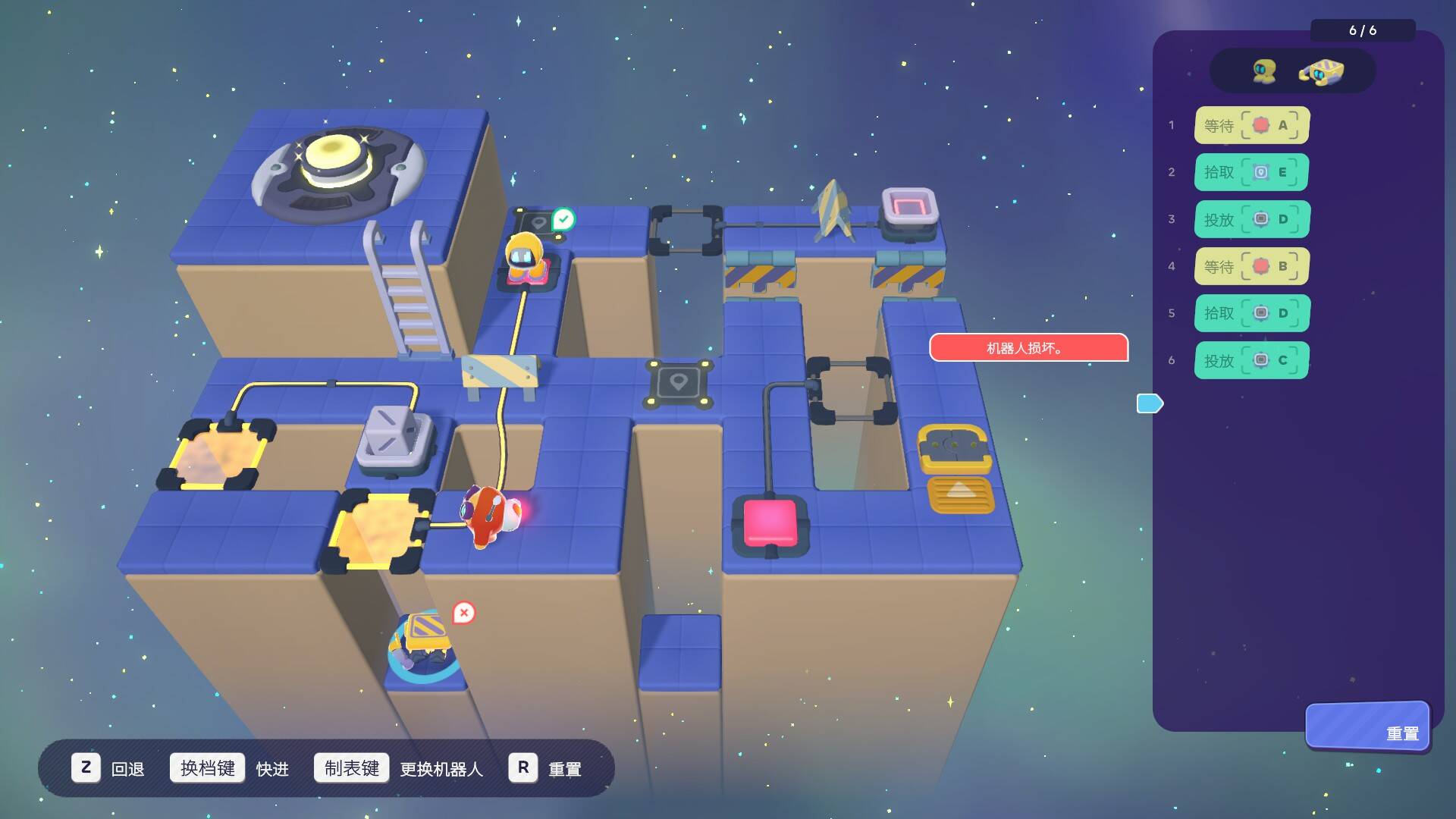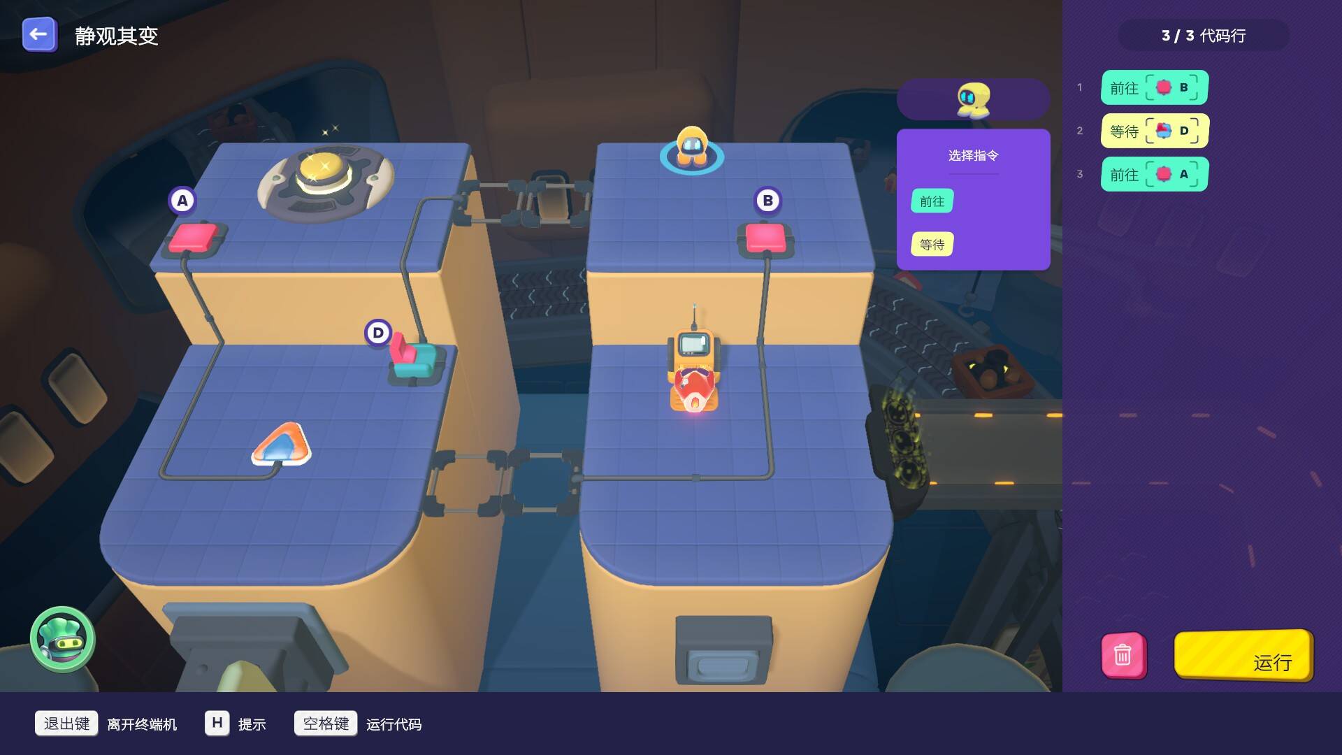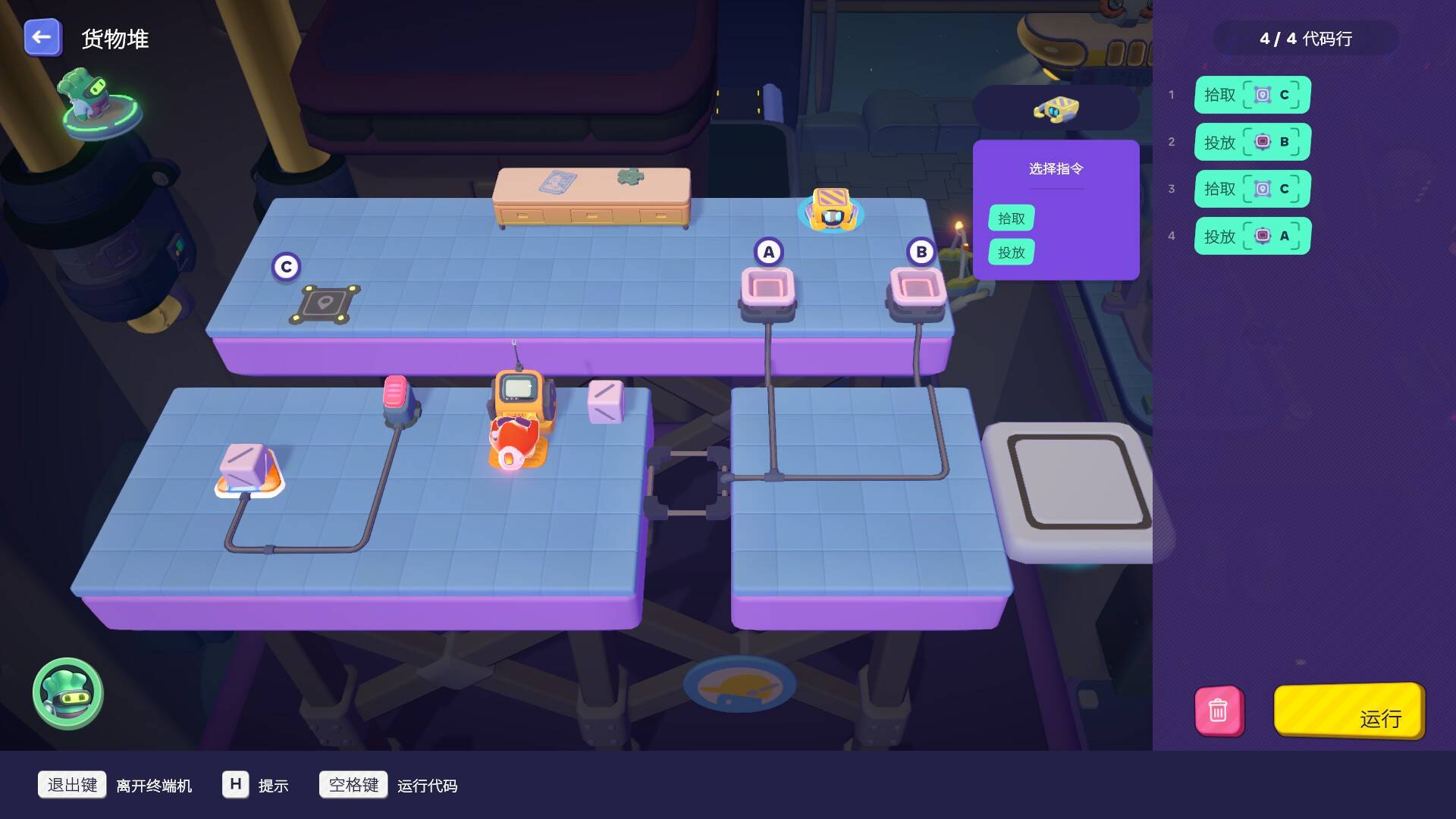 每个关卡内系统只会放出与当前谜题相关的指令,可以看到机器人的指令有“拾取”和“投放”,按照图上代码操作便可以简单的编程,点击“运行”后机器人便会按照指令依次行动,其会往返C点两次来拾取道具,并将其投放于A/B槽位。
