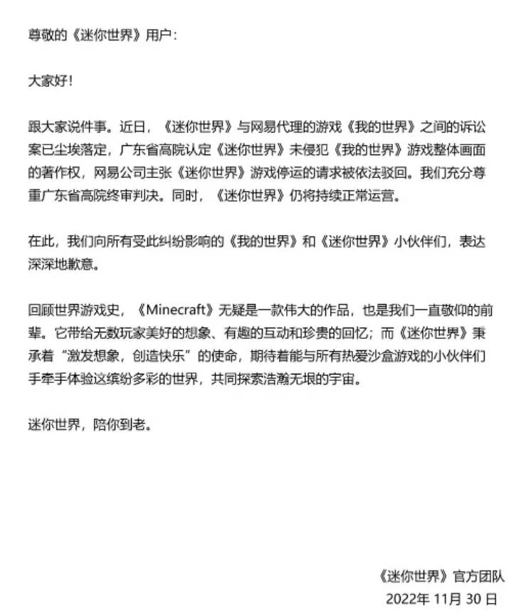 《迷你世界》也针对此事发表了公告,并且表示服从判决。当然,他家的公告有点“春秋笔法”,只写了法院判其画面未侵犯著作权,以及驳回停运请求这对他有利的两方面。