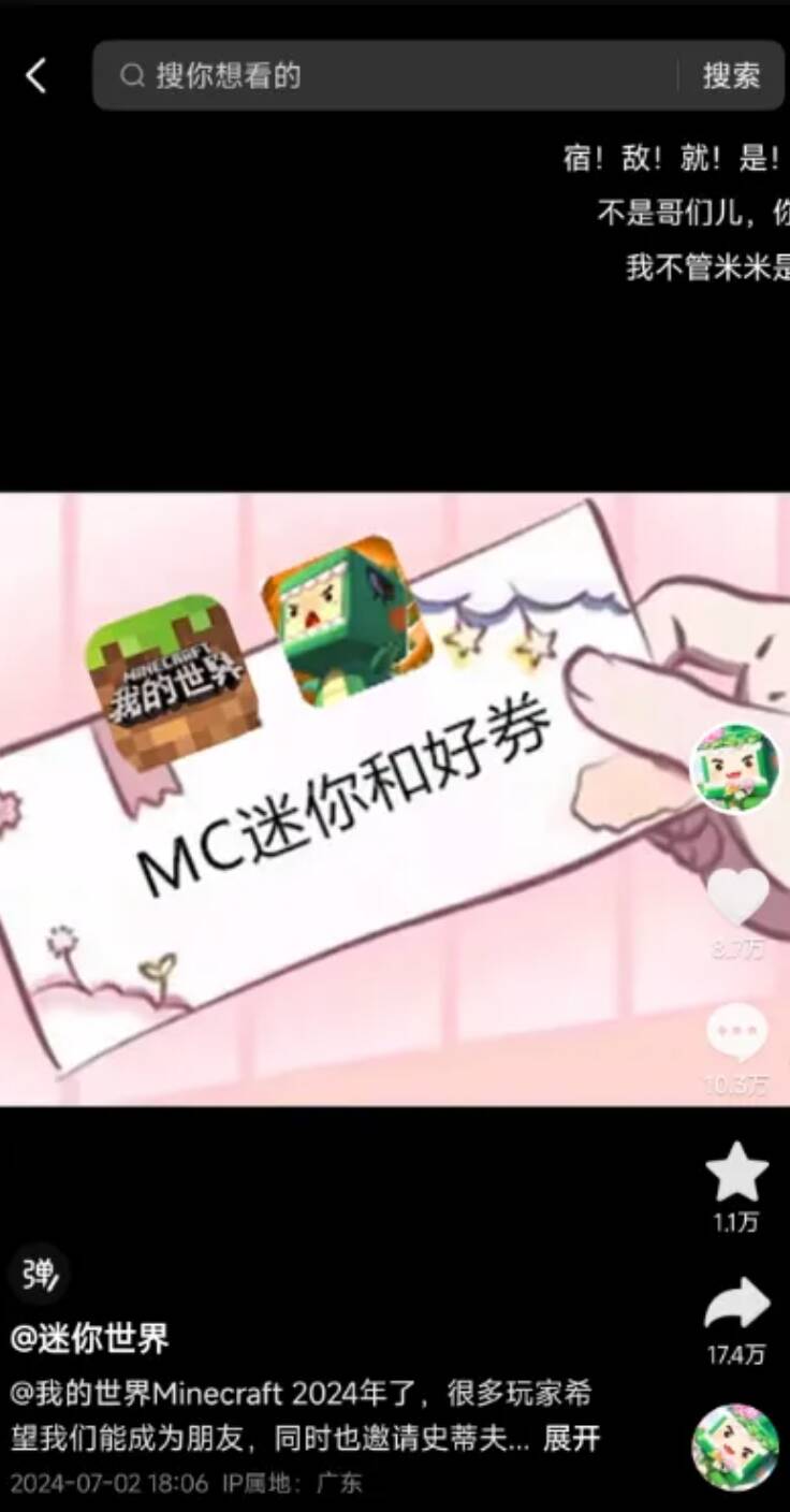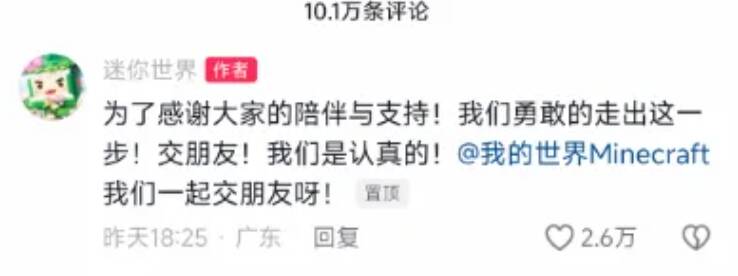 就此,快2年过去,两边官方不再有互动或交集,一直到昨天……《迷你世界》官方亲自发出想要和《我的世界》和好的信号,并且在评论区里面圈了《我的世界》官号。