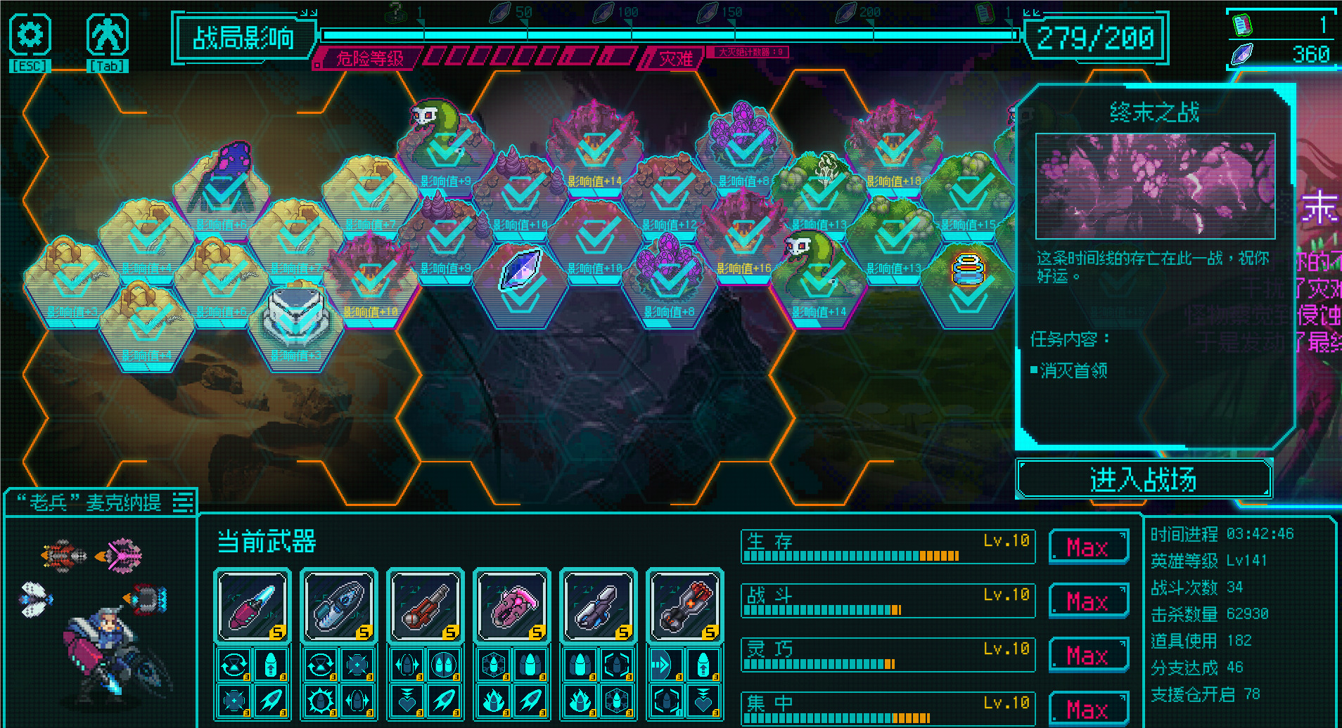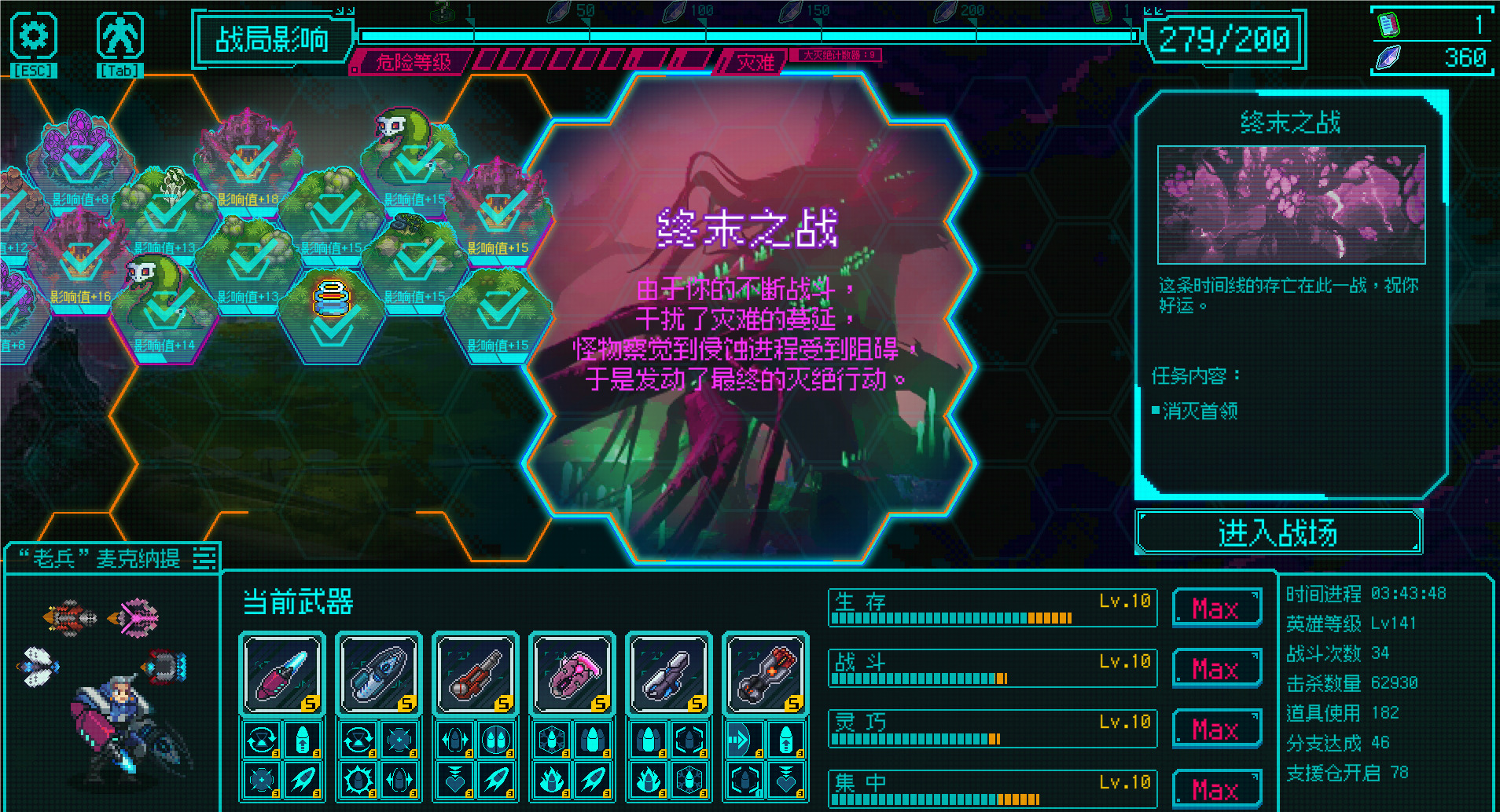 游戏共分为四个阶段,前三个阶段主要是完成任务,获得提升,最后一个阶段是最终BOSS。每个阶段有10个区域,其中5个区域是必须进行的主线战斗,另外5个区域是探索构建区域,需要进行探索(抽奖),可以探索出三个类目,包括装备技能或地形,如果探索出的类目有地形,那么这个区域也可以进行支线战斗。