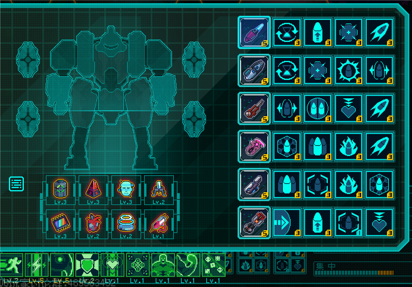 四位战士有不同的技能,各属性值也不同(属性值可以升级,最高升至十级)。左右手可以装备两个武器(可以通过鼠标来指向攻击方向),浮游炮可以装备四个武器(自由开火),每个武器都有四个插件槽,可以提升武器的效果,部分武器槽和装备槽需要自行解锁。武器目前丰富度不算太高,但是插件的设置蛮有趣的,某些插件装备在不同武器上效果是不同的,让我有点纠结。