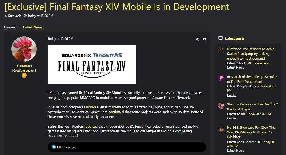 知名泄密者Kurakasis在Exputer论坛上声称,移动版《最终幻想14》正在开发中。据称该移植版本由腾讯负责,史克威尔早在2018年就与腾讯达成了战略联盟。