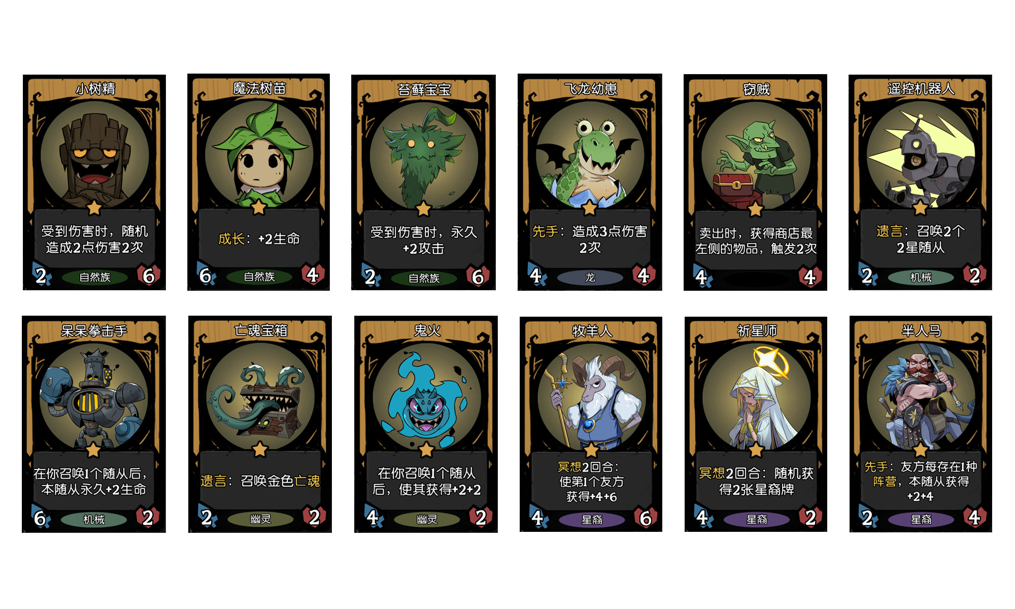 那么这边推荐的一本金色随从。可以去拿的有这些,有半人马必选,其他的战力卡都差不多。需要特别注意一下,如果能开到金水獭,也可以拿,金水獭是唯一一张,拿了之后不需要**就能直接1回合升本的随从,而且6/4的体型也还行,2回合就能直接拿2本卡了,岂不是很香香~~