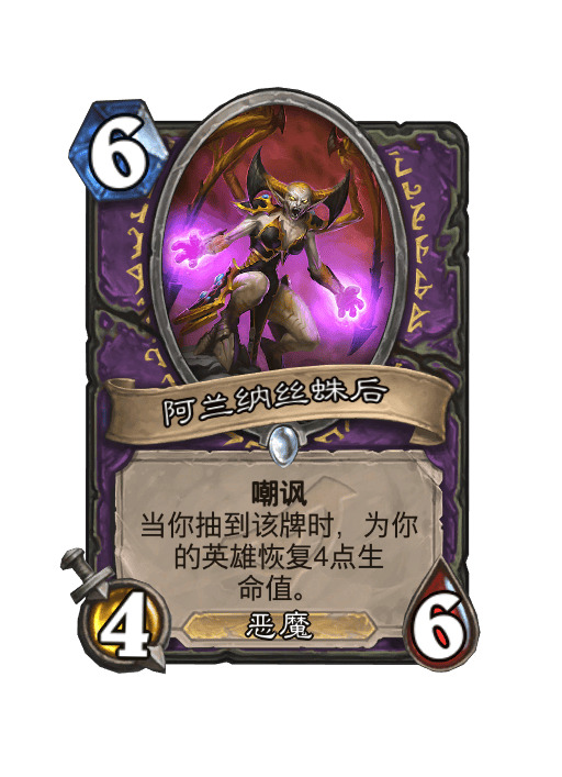 ● 我们场上有幻化师的时候抽牌库中的阿兰纳丝蛛后,可以看到蛛后的回血效果会正常的触发,但是她们也不会被幻化师变形,把鼠标放在阿兰纳丝蛛后上也能看到她有抽到时施放的标签