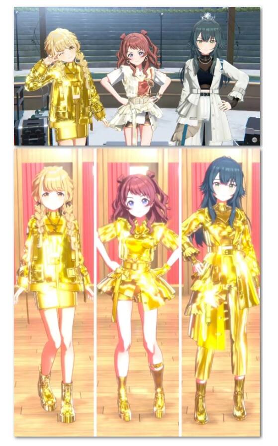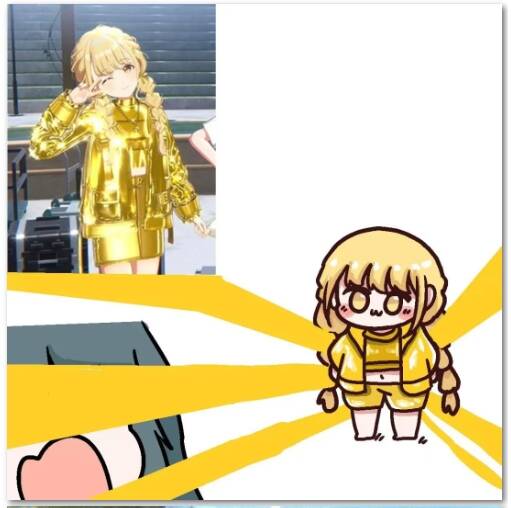 大概上周的时候,游戏中又新增了一个天梯模式,随之赠送的纯金色打歌服因为又土又潮又神经的样子得到了出圈,我在至少三个讨论群里看到藤田琴音穿金色衣服跳舞的动图了。
