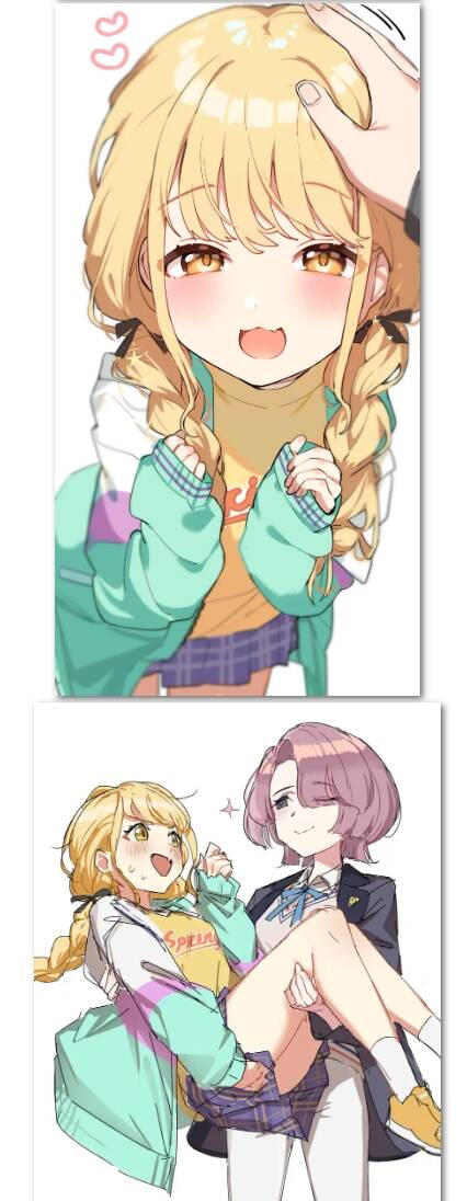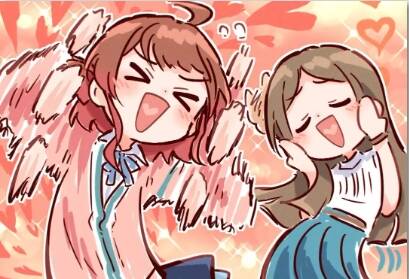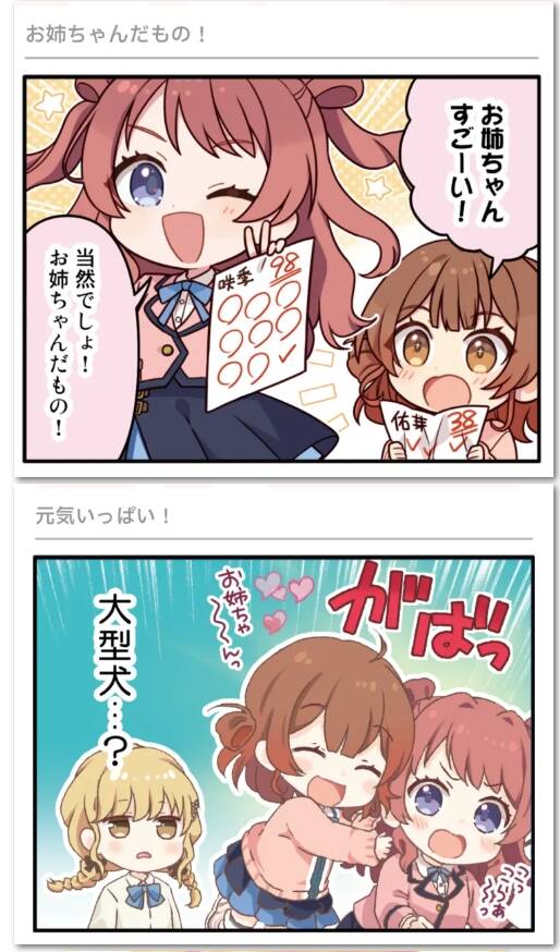 《学园偶像大师》的看板娘叫花海咲季,但据说她的妹妹花海佑芽才是企划刚开始打算定的主角,因为姐姐性格更有趣而捷足先登了,剧情中妹妹因迟到缺席了开学的演讲,姐妹二人在偶像道路上是竞争对手,但又发自内心的相互喜欢,家人之爱,非常美味。