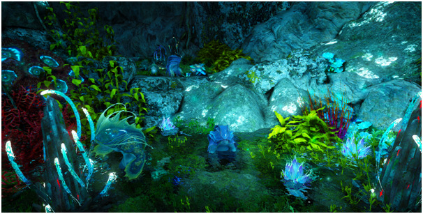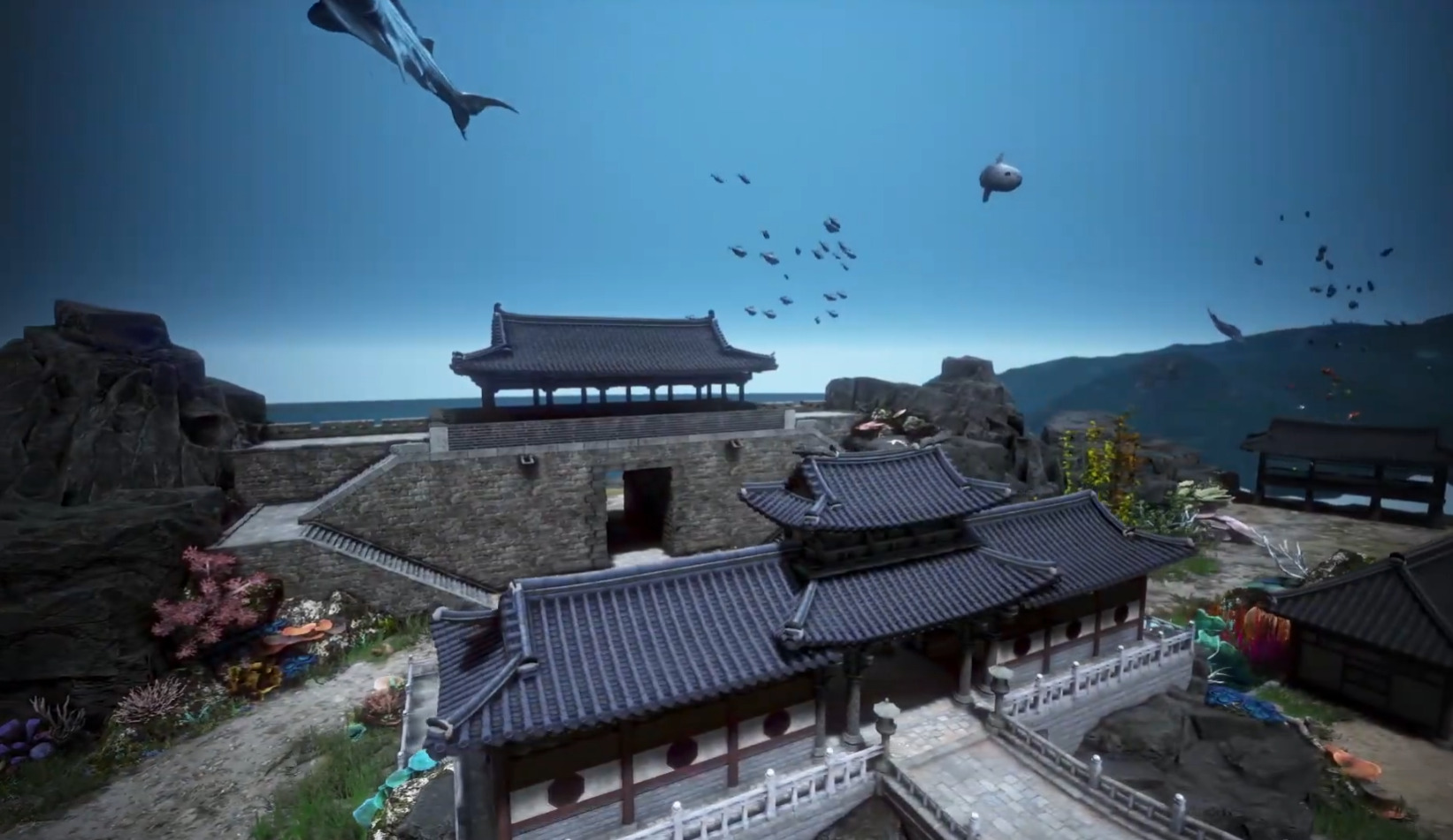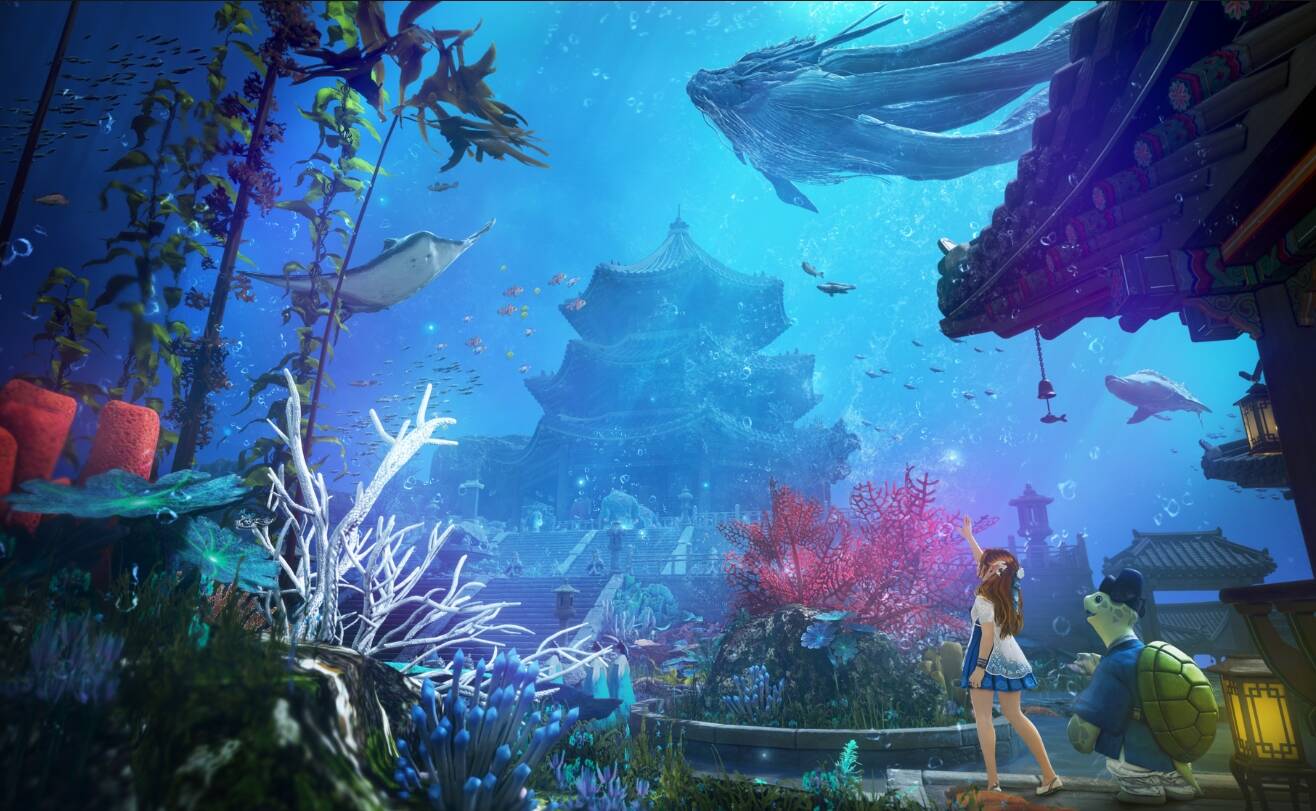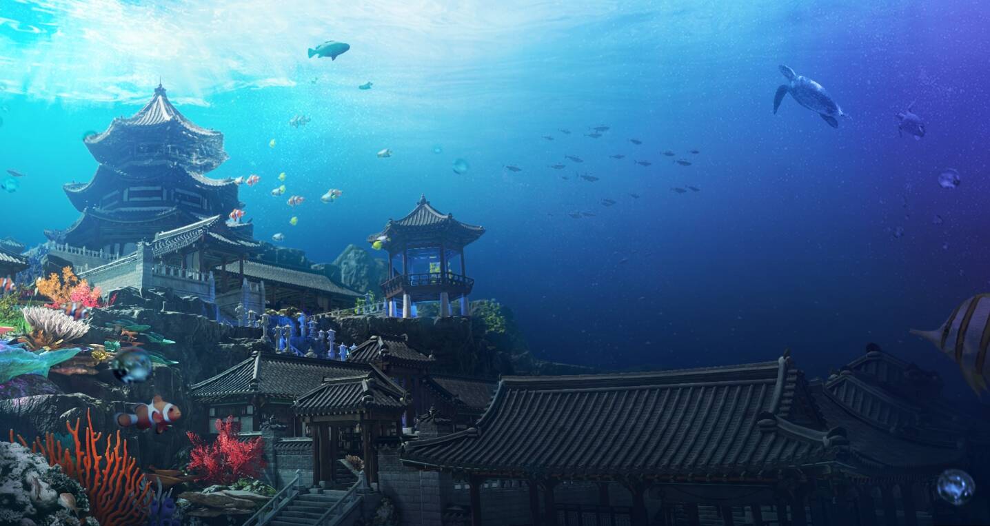 当冒险家们穿着潜水服来到水宫后,就会发现自己仿佛进入了一个童话般的世界。鳞次栉比的中式房屋搭配上水草与珊瑚的点缀,宫殿的感觉铺面而来。建筑间的瀑布与头顶上偶尔游过的鱼群,更是给地图增添了一些梦幻色彩。