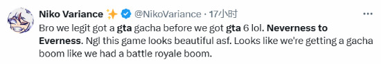 “兄弟,我们在玩《GTA6》之前就已经玩到了二次元GTA哈哈哈,《异环》这游戏看起来非常棒。看起来二次元热潮要来了,就像之前大逃杀热潮一样。”