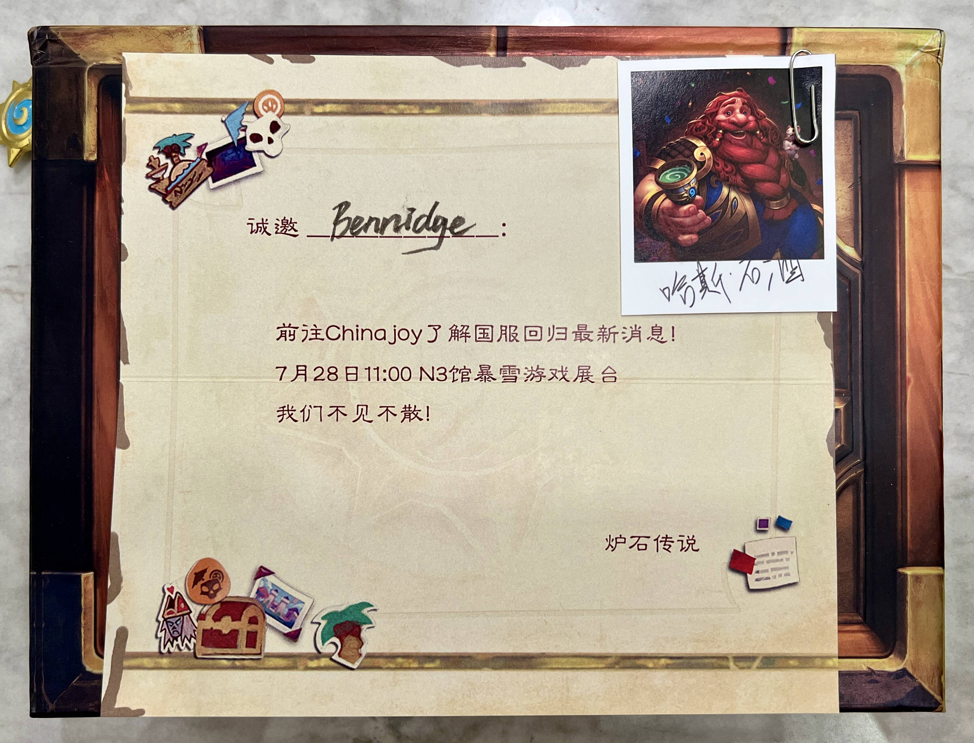在飞往胜地历险记的同时,也要飞往ChinaJoy。我们收到了来自旅店老板的请柬,邀请我们现场了解炉石国服回归的最新消息。7月28日11点,目标,暴雪游戏展台!
