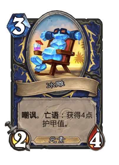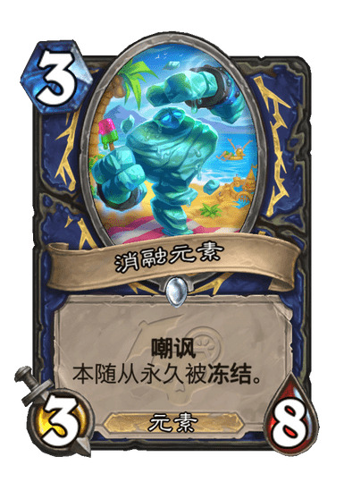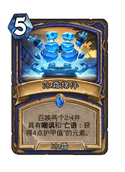 消融元素和冰霜摆件都是比较好的混子牌,站住了前期非常重要的3费和5费回合,这两个回合分别是极限快攻和快攻的发力回合。新版本肉眼可见的由随从和武器带来的直伤增多了,嘲讽的阻挡作用也进一步提升,嘲讽在控制体系中的地位也渐渐赶上解牌和恢复牌。在这套构筑中,冰霜摆件除了有提供冰霜派系的作用,还由于召唤出来衍生物冰雕是元素,可以通过贴可靠陪伴增大找终结key牌伊辛迪奥斯的概率 。
