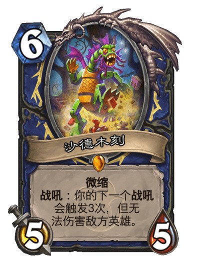 此外,在对战快攻卡组时不卡手,也可以直接丢了作随机的小补刀,配合可靠伙伴和曲奇打下小节奏。对战慢速卡组时,1费也非常适合6费沙德木刻本体的战吼,可以说使用场景也很灵活。