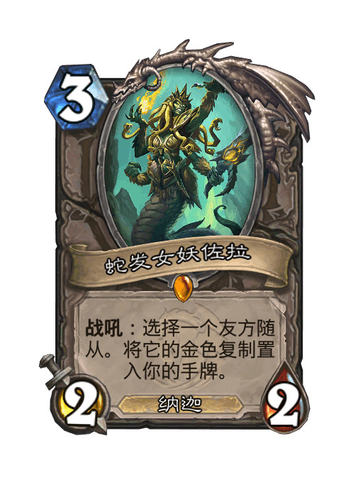 蛇发女妖佐拉。使用场景极为复杂多变,需要对局总结经验。收沙德木刻是打多战吼方向,使用场景是对战压力不大的控制卡组,一般收微缩版本就够用了,3张微缩正好对应3种战吼伤害来源,飞行员帕奇斯,炫目演出者,伊辛迪奥斯,还有卑劣的脏鼠破坏控制卡组的一些重要终结组件。收744是打铺场,如果之前下了沙德木刻能收3张744,连铺4波场,这种压制力可以碾压其他随从交换卡组。收飞行员帕奇斯还是伊辛迪奥斯则要根据对方血量和自己的手牌状态来判断最快终结对手的斩杀方式。 佐拉可以同时拉高卡组的上下限,有时沙德木刻被搞掉后也只能通过佐拉来挽回部分斩杀手段。值得一提的是,744召唤的一些5费随从看情况也是可以选择回手的,5费战吼牌很多,不要死板得去打卡组中的固定套路,佐拉极大得增添了卡组的灵活程度。