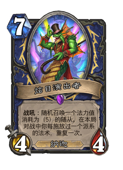 海妖之歌,这张牌在对阵快攻时会很薄弱,所以只带了一张,是用来配合744铺场中期给控制卡组上压力的。使用过海妖之歌提供的法术后,744单卡就能做到几乎满场。试想下对控制卡组时打得再慢一点,再加上沙德和佐拉,可以连铺出几波炫目演出者,很可能使没有足够多大解的控制卡组断解。写到这里也不得不提下一些明星老卡在新卡组中的亮眼发挥了。