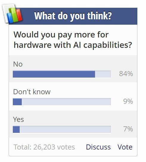 近日外媒TechPowerUp发起的一项调查“你愿不愿意为AI硬件多花钱”?结果显示,绝大多数PC用户不愿意为AI PC花费更多的费用!