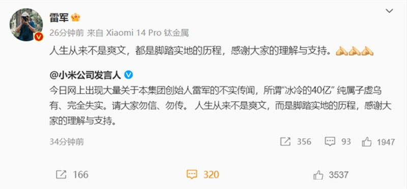 小米表示,人生从来不是爽文,而是不断突围的历程,靠勇气来披荆斩棘。雷军之前一直被网友称为爽文男主,雷军本人对部分传闻进行了辟谣,比如之前传闻很火的“人生低谷时卡里只有冰冷的40亿”。另外,雷军也表示自己并不是高考状元,并没有考700分。