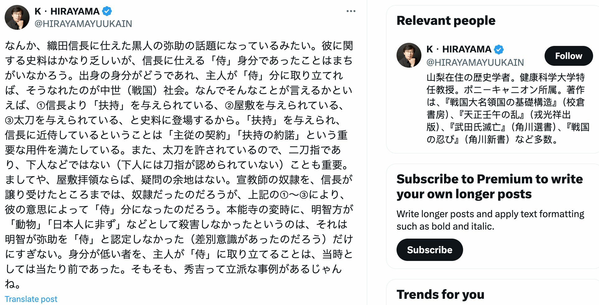 平山悠表示:“黑人弥助的历史文献很少,但毫无疑问他是侍奉信长的武士。无论社会地位如何,只要被主人提拔,就可以成为战国武士。历史文献表明,信长给了弥助俸禄、房子和剑。弥助与信长关系密切,接受俸禄并侍奉信长,显然是严格履行了主仆契约要求。不过弥助不仅仅是仆人,因为他可以携带剑。而当时仆人是不允许带剑的,但弥助是个例外,他还得到了一套房子。”