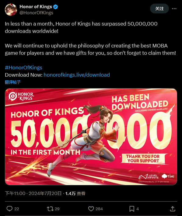 《王者荣耀》国际服于 6 月 20 日在全球范围发布,此前游戏仅在我国、巴西、土耳其等少数国家运营。近日开发商天美工作室群宣布,自全球范围上线以来,《王者荣耀》的下载量已经超过 5000 万次。