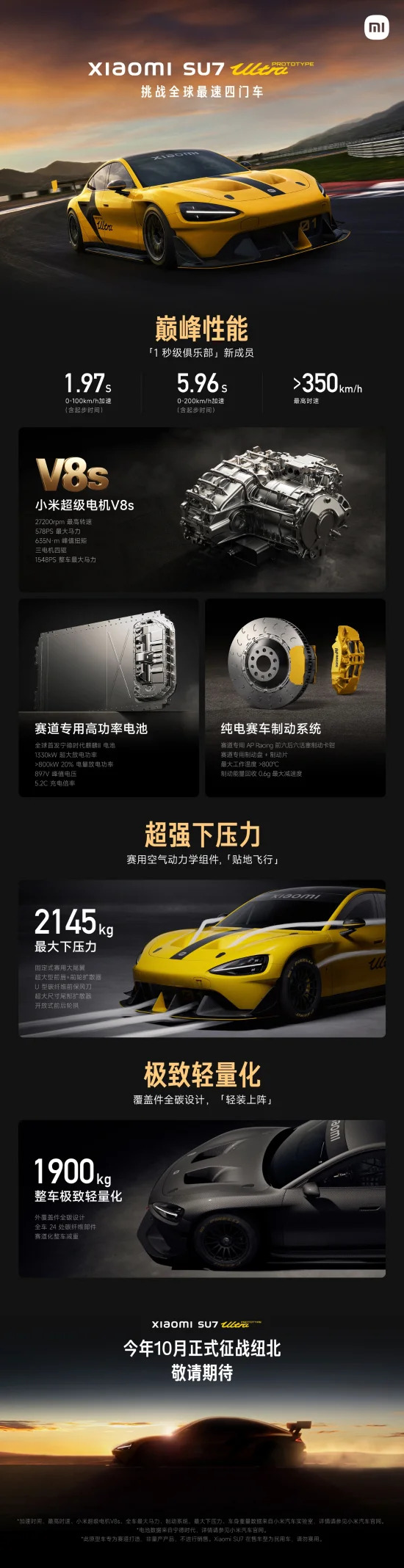 在今晚的直播中,小米创始人雷军表示,小米 SU7 Ultra 的量产车采用和原型车相同的底盘结构、三电机和电池包,不过由于成本太高不会使用全碳设计,该车将于明年上半年发布。