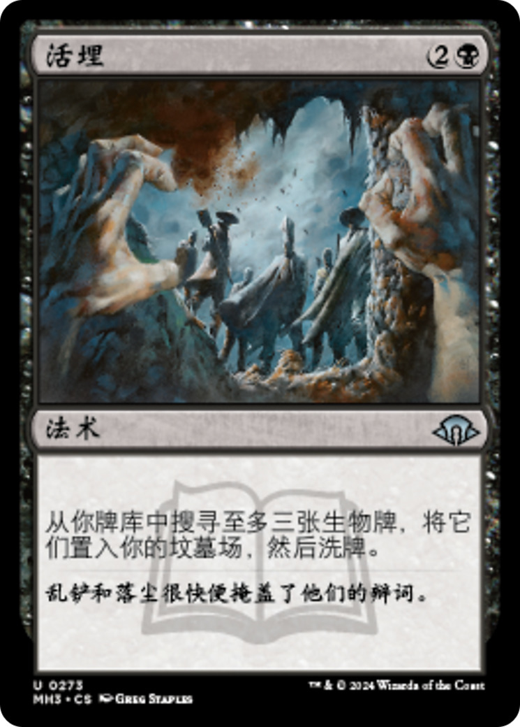 活埋是组合技提速的关键单卡,3费定向堆三张生物进坟,在满足2张鼎镬佣兽进坟的同时,可以让我们把依格拉放入坟场,方便我们之后用怨灵掘出来,极限情况下1费2费下一个小人,3费活埋堆坟,4费怨灵直接拉出依格拉完成斩杀