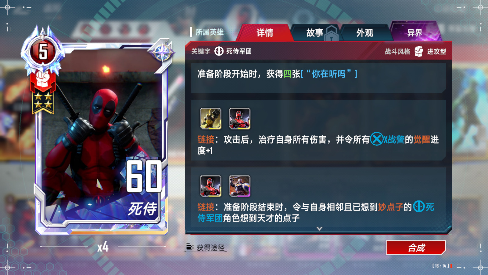 命石给复活死侍提供了思路,我是单纯很喜欢界白死的效果,所以带这个,其他小伙伴也可以试试死亡女神红死啥的复活流死侍,我还没尝试过。死侍作为我最喜欢的漫威角色之首,我也是在26号凌晨的时候就去买了哈尔滨的首映,熬夜也要看,哈哈哈哈,电影属于纯纯粉丝向电影,剧情很简单老套,不过特效打斗画面都没的说,如果不是漫威老粉电影中很多的梗可能会看不懂,建议看不懂的小伙伴去温习一下以下学习资料(轻微剧透慎看):