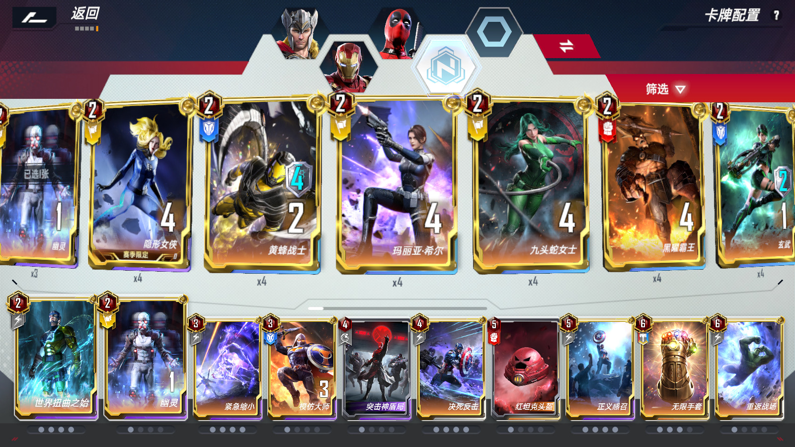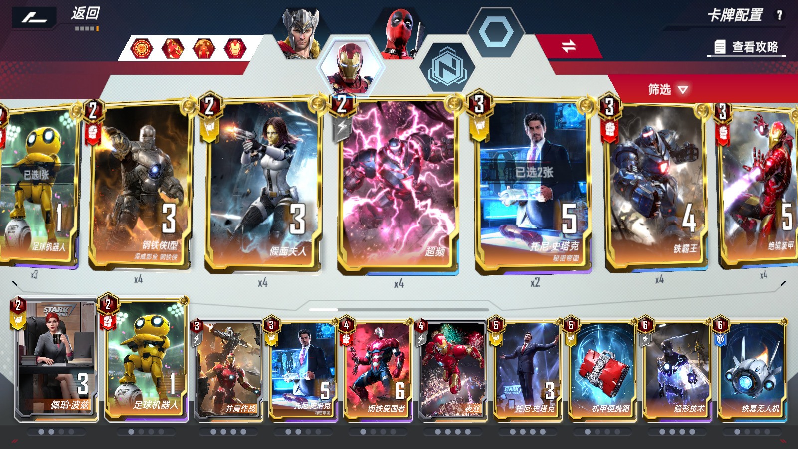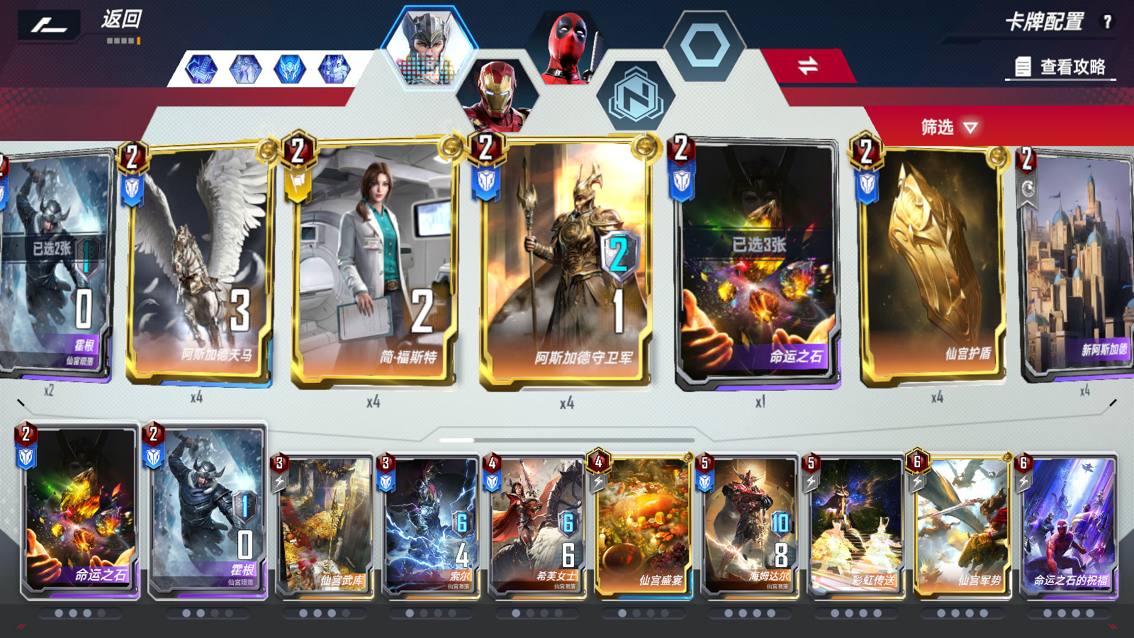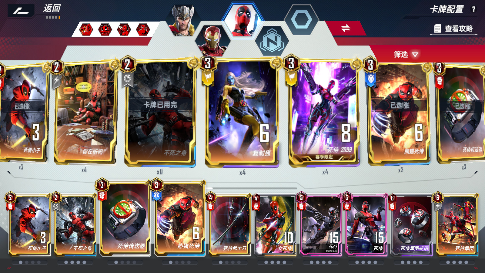4回合前主要检索霍根熊猫辣椒小子仙宫武库,死侍事件前期1张就行不用太多浪费经济,4回合前主要检索到两张仙宫武库最好