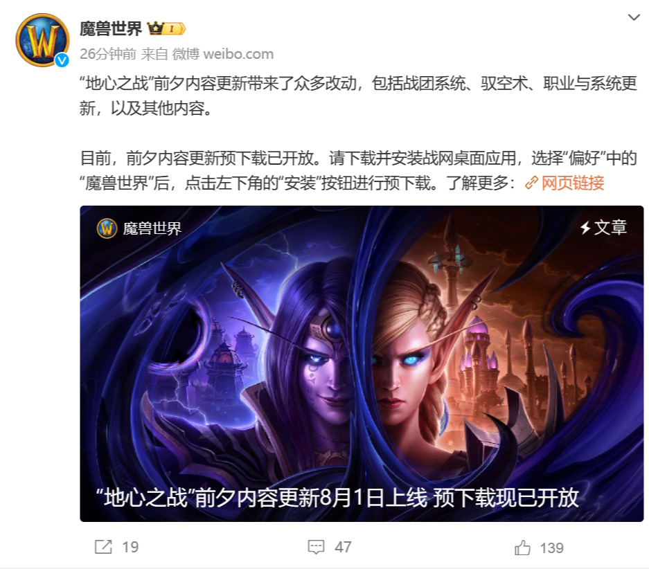 《魔兽世界》官方于7月26日凌晨发布消息,宣布《地心之战》预下载正式开放。玩家现可登录战网,提前下载《魔兽世界》正式服客户端,做好8月1日重回艾泽拉斯的准备。