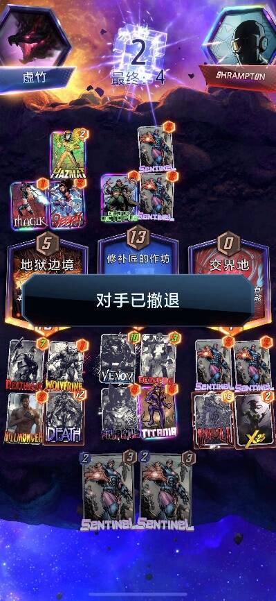 对手6回合只下了一张2费生化女,点数落后太多,7回合已经难以追上选择撤退,我方赢下比赛。