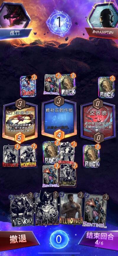 对手三回合只打了一张哨兵,可见这局对手也很卡手,这里其实已经可以点snap了,但因为考虑用吞星,可以再等等看看局面,本回合打了卡耐基在中路摧毁死侍,金刚狼在左路补战力。