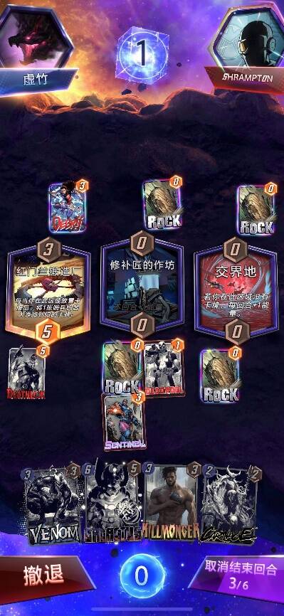 对手也是空过了一轮,第二回合抽了张卡耐基,打不出去,3点能量不想浪费,在左区打下死灵锁补点战力并补牌,这时候如果对手snap我会考虑撤退。