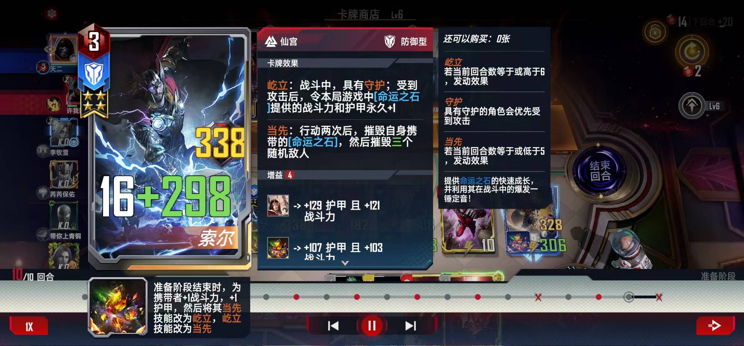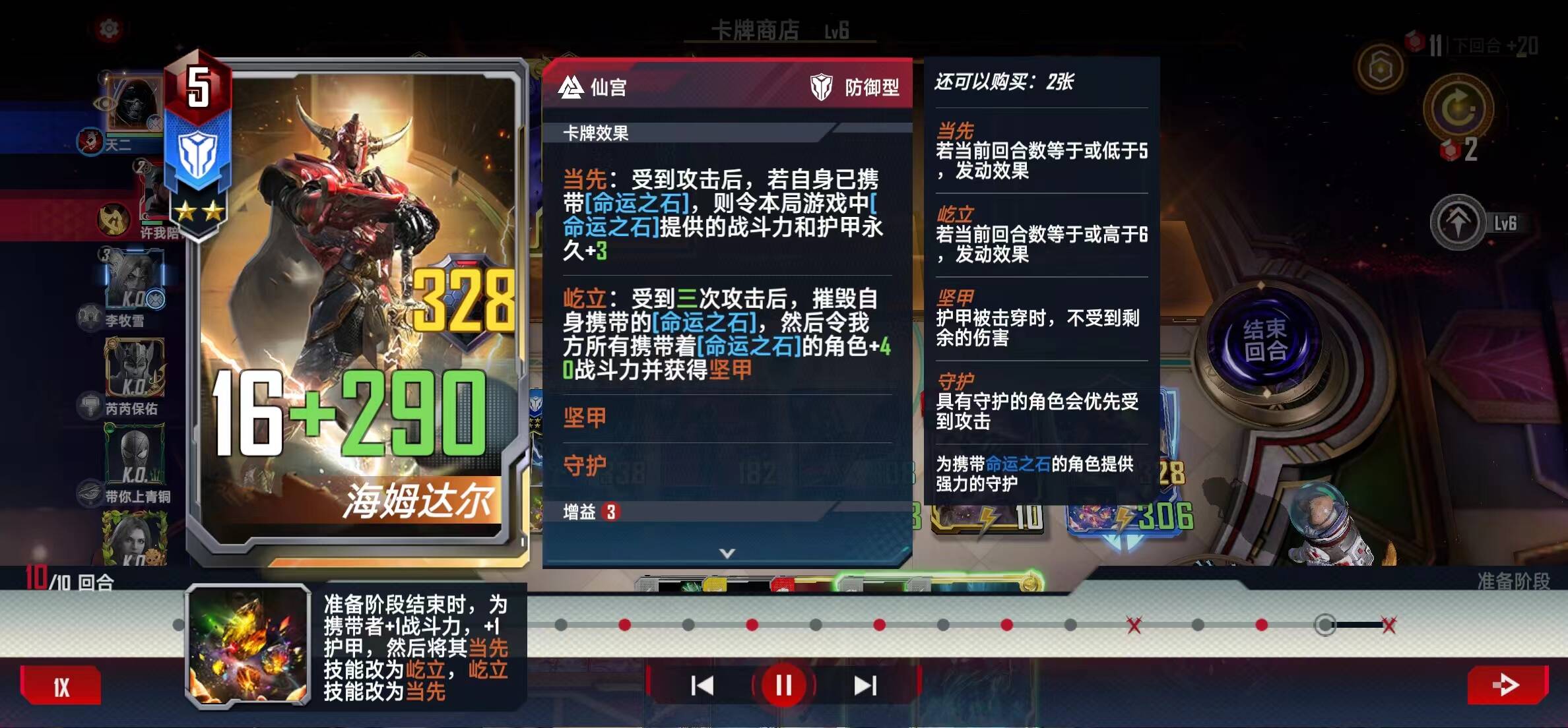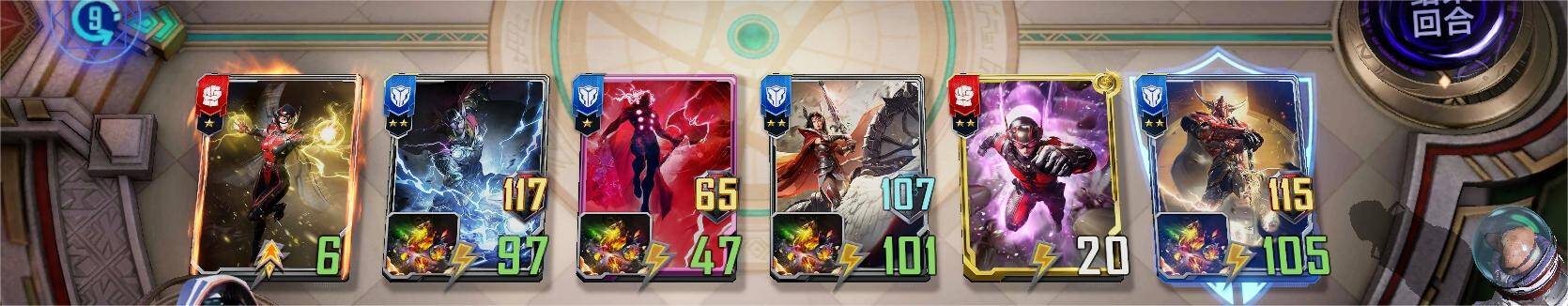 五回合上五级,开海姆达尔和希芙,希芙先不上命石(留到六回合上),海姆达尔可以上命石(如果没有希芙和她的命石)也可以不上(如果已经有希芙和她的命石了),有红索尔、加血、黄蜂、蚁人、索尔坚甲、托尼都拿。