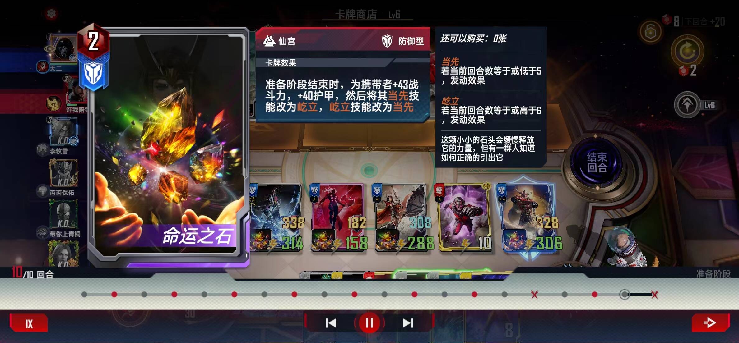 第二回合如果一张好蓝或者夫人或者钢铁侠都没有,就D一次,赌霍根或命石,然后再上3,前期就是战斗力越强越好但是命石更重要,有命石就有战斗力,前期降速的情况下,前期多找命石是很舒服的。如果二回合能有两张以上命石就很难输了。