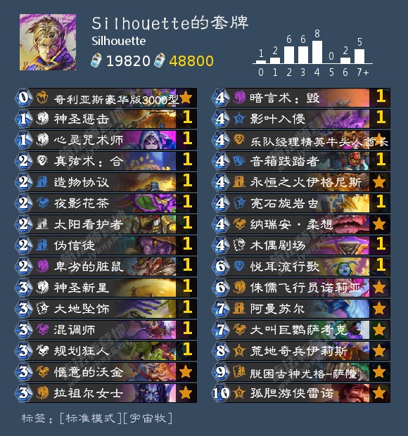 我觉得牧师这个版本属实不弱,有点被低估了。我月末突然炉石瘾犯了,刚捡回来美服账号。虽然只有6颗星加成,但还是赶在月底上到传说,20-9是从钻五开始计算的数据。