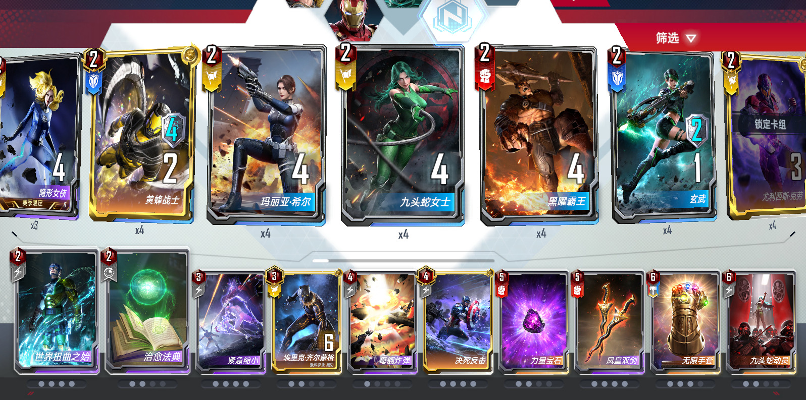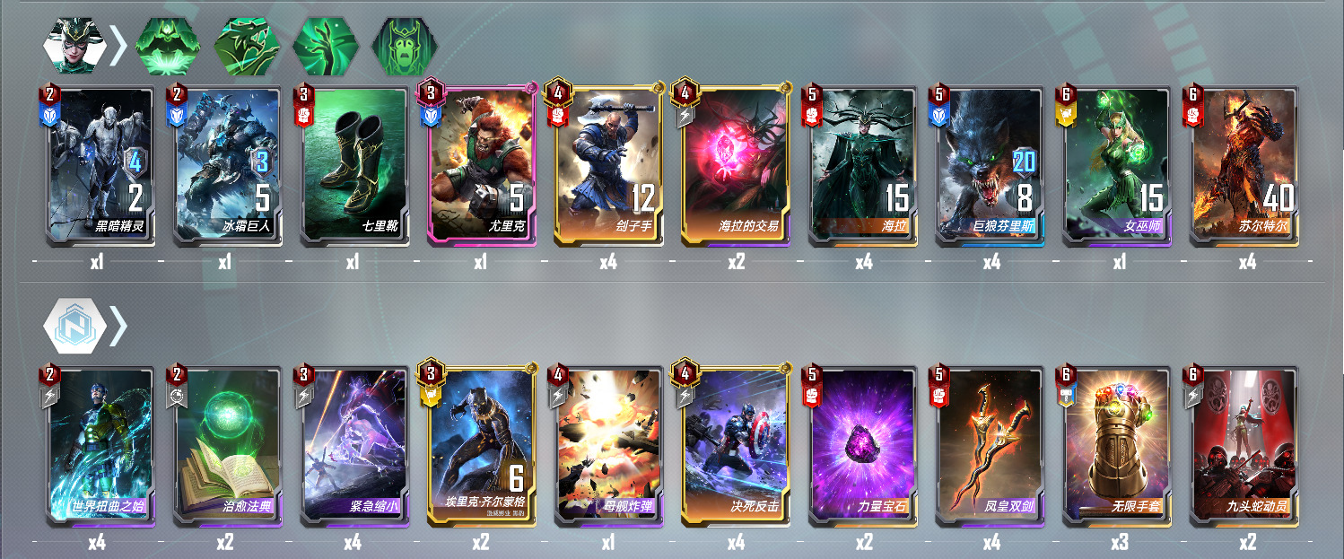 大家好,我是天机战队的黄蓉我老婆咋了,uid 1898801012,虽然我是漫威对决的老人了,但这是我写的第一篇攻略,从一开始的初始卡组,玩到天临四将、死侍卡组,一直到现在。曾经上王的几个卡组有白死勇度、绿皮勇度(这之后的几个赛季处于退坑状态)、索尔终幕碰瓷、秘境魔、异界蜘蛛套娃、时间宝石膀胱版(托尼辣椒挂机刷血转刷光束)、时间宝石砍头、时间宝石鞭狂等等,近几个赛季,我玩的卡组中,老的卡组逐渐跟不上版本(譬如并肩削弱之后不想再碰影响责任)而强力的时间宝石卡组则是迎来了一步步的削弱,导致我这个赛季发现竟然没有卡组可以稳定的上分,这个赛季确实更新了许多强力的卡牌,譬如异界死侍、异界古一、黑凤凰链接等等,包括出场率高的批爆的铁拳任务,玩剑宗在星辰打转了一周之后,我突然想起上个赛季遇到的一家海拉安吉拉链接砍头——当时我25+血,在3张缩小的情况下硬是被他砍死了,于是我开始在营地、b站找相关教学视频,看到星动的视频之后,我由于时间宝石挨刀而不想玩的苏特砍头卡组再次被我搬了出来,不知道各位看官有没有被我砍过呢~卡组详情如下所示: