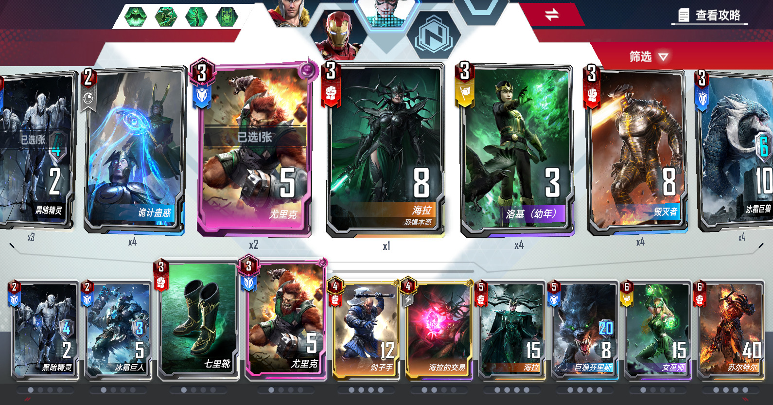 5回合之后:靠扭曲快速拿到托尼,提尔、巴尔德和刽子手,提尔看到必拿,巴尔德看到尽量拿(防止被烧),刽子手可以靠事件拿,所以低费的俩打工仔看到就可以拿,之后就是扭曲滤牌买牌的老套路,这里不多细讲,唯一注意的就是决死反击这个时候就可以带着买了,尽量血量不低于15,大概成型阵容是:机器(有宝石更佳)+托尼(拎箱子更佳)+小辣椒+刽子手(带凤凰剑)+提尔(带凤凰剑)+巴尔德,这个时候就可以上6本了,一般来说手里都会有5本时低费买下的海拉,6本主要搜安吉拉、高星级苏特、手套,2星其实大部分时间就够了。上6本之后其实小辣椒和托尼钱就赚的差不多了,可以把他俩卖了(卖之前一定记得把高费钢铁侠卡牌先卖掉)腾出位置上海拉和狼,这个时候一般三兄弟已经打得比较吃力了,后面大概率会输一把,甚至血多三兄弟链接也可以拆了,上俩狼,保证狼把机器吃了给海拉涨涨身材,最后成型阵容看我后面视频就行。