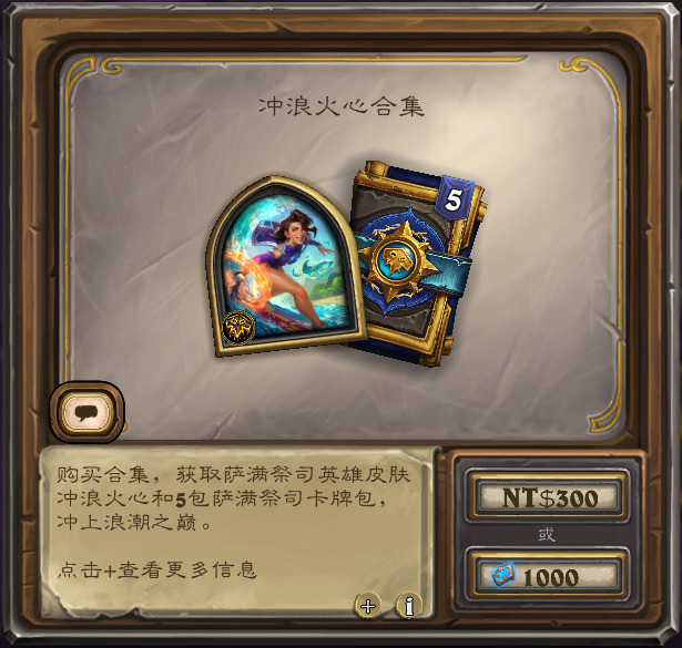 含构筑模式萨满新皮肤“冲浪火心”和5萨满包,售价1000符文石。