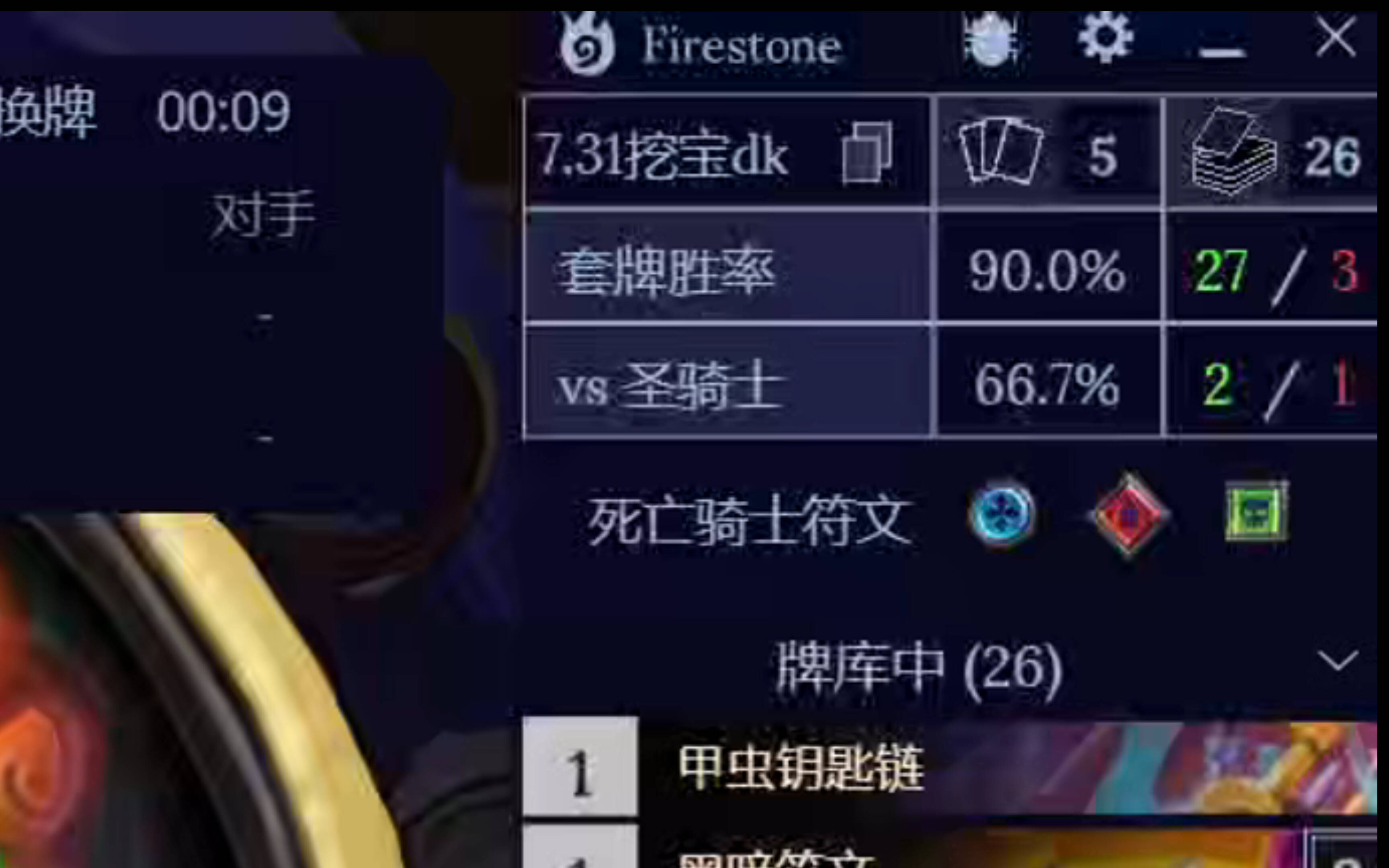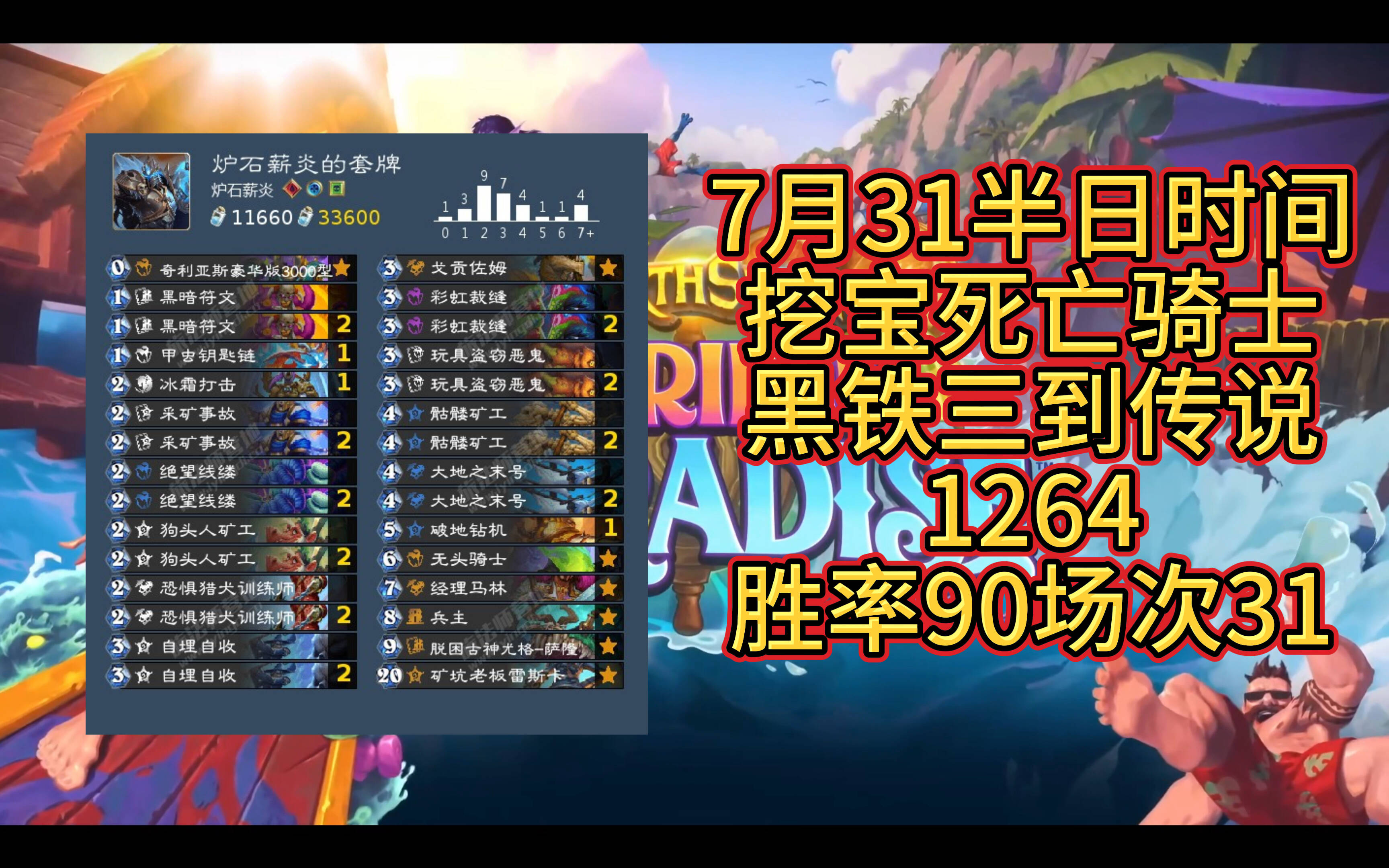 大家好我是炉石薪炎 一个新人UP主目前在抖音和b战,发布一些上分卡组,本期给大家带来这套死亡骑士卡组在7月31日今天黑铁三开冲到传说1264卡组胜率90场次31胜场28这套卡组带突袭卡新卡恐惧猎犬狮2费卡采矿事故和依靠随从死亡刷新的**之末号,抢占前期场面优势后期依靠玩具恶鬼经理马琳打出源源不断的场面优势从而取得胜利