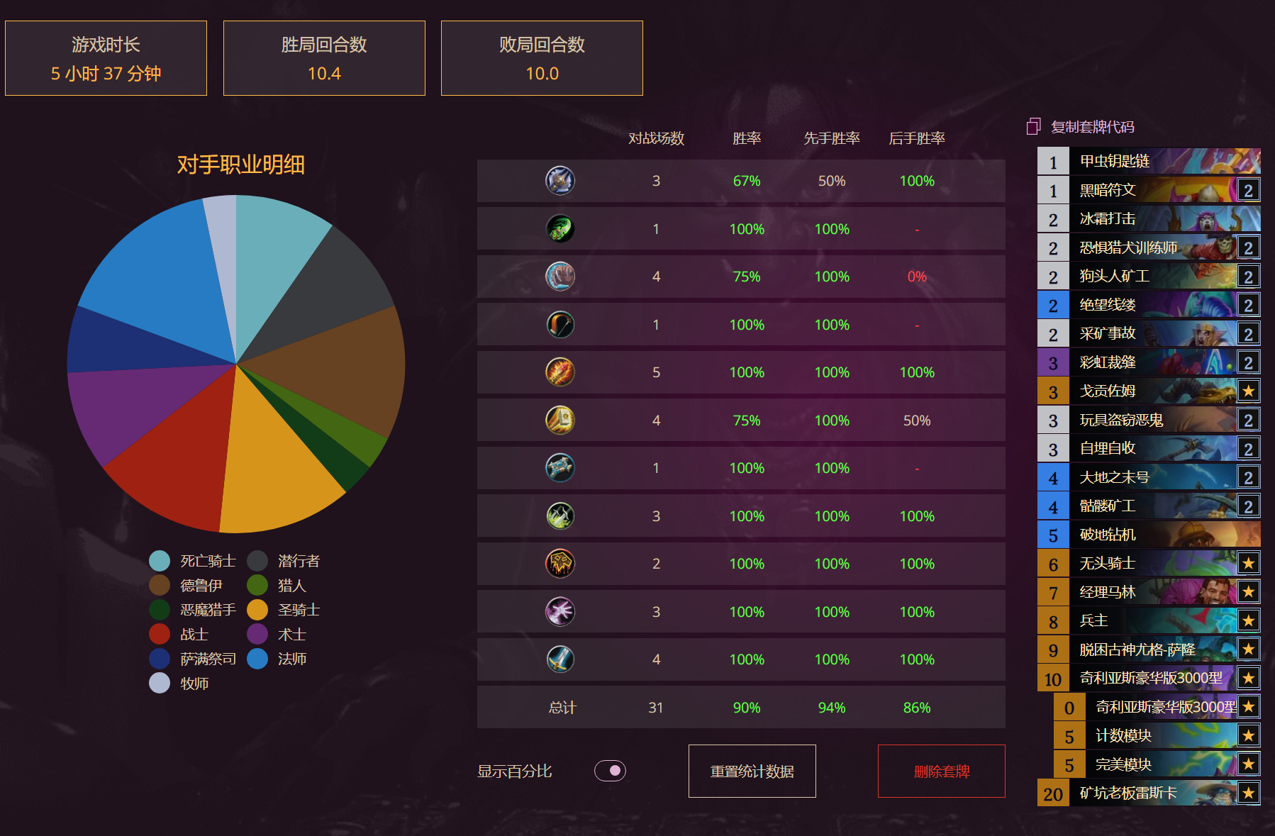 这是对战各职业卡组胜率由于是黑铁三冲的传说1264,碰上很多玩的不好的所以胜率会偏高一些,但是90胜率上传说也能说明这套卡组的强势拉,时间关系就说这么多吧全是手打的如果觉得对你有帮助可以去抖音b战搜炉石薪炎查看我更多视频,目前一直在更新主流卡组争取日更吧