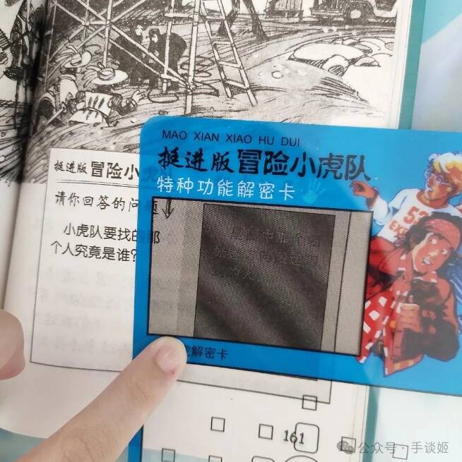 所谓《冒险小虎队》,姬几年前在公众号提过,是系列丛书,其书本后面有个“超级解谜卡”的玩意,通过和书本后面的摩尔纹重合,就会出现谜题的答案,可能一些姬友小时候玩过。