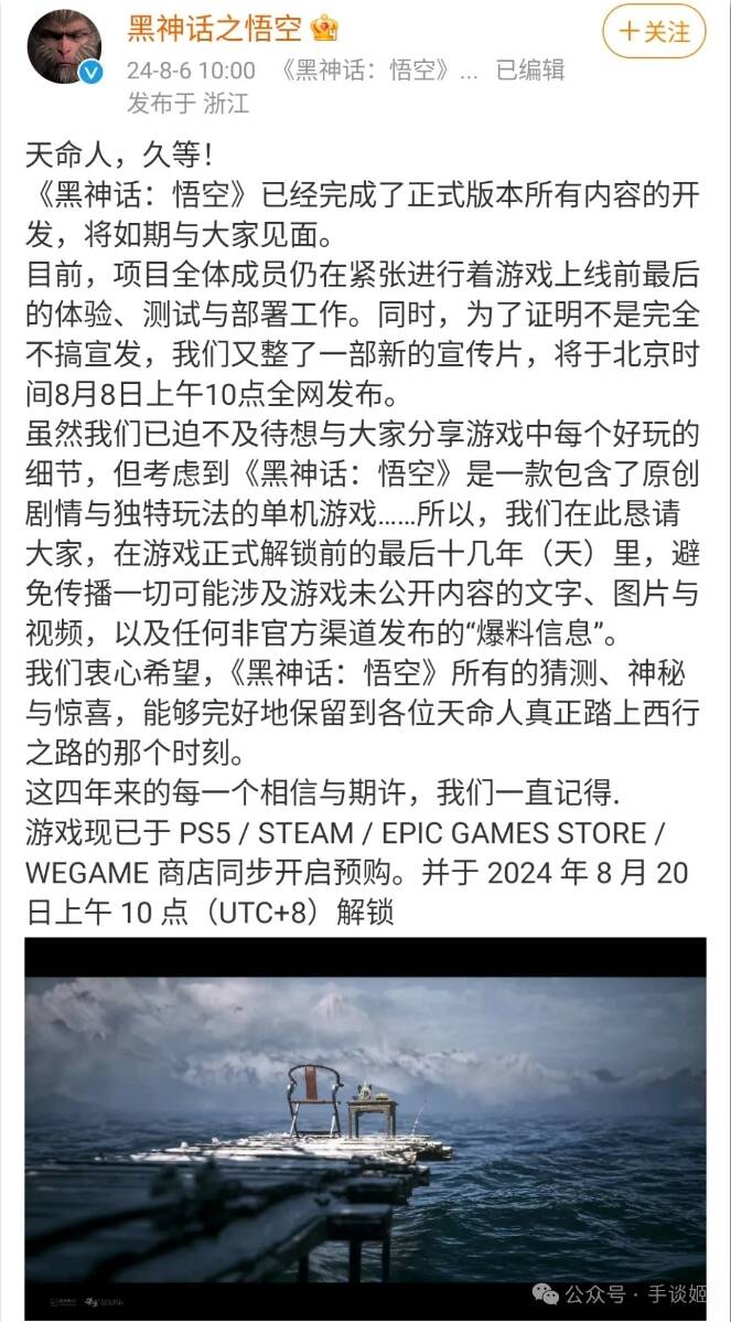 如此看来,游戏跳票的可能性非常小,如果手谈姬当天没有更新公众号,请姬友们见谅,你一定能在B站或者视频号直播间看到姬在打《黑神话:悟空》。咳咳。