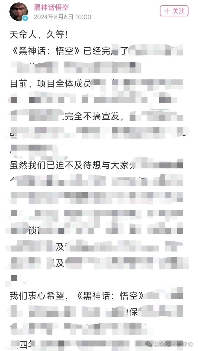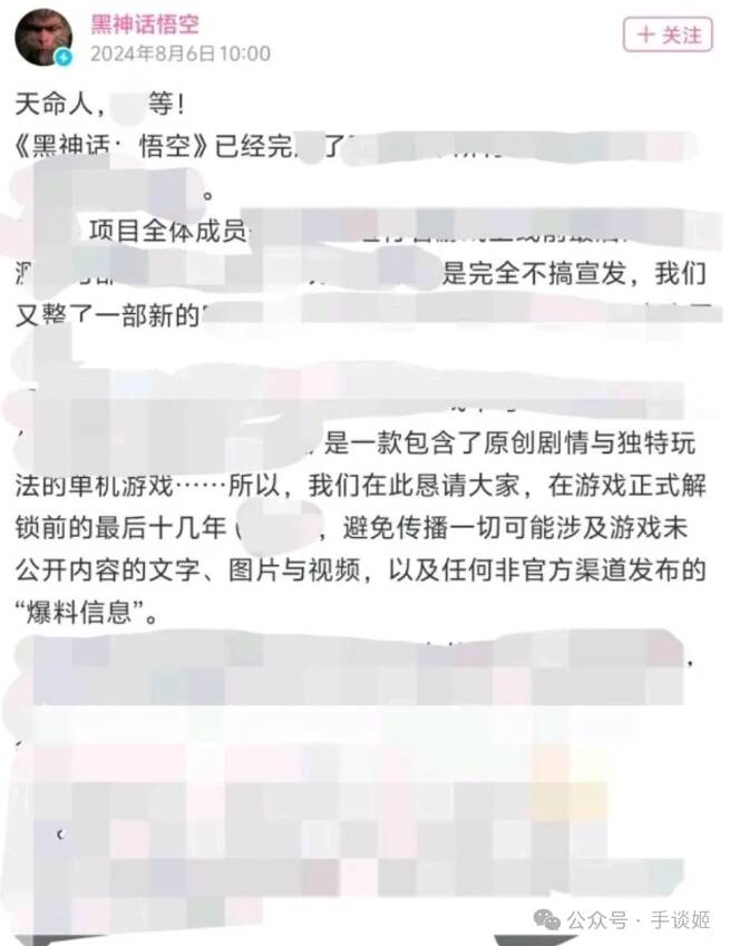 8月6日上午10点,《黑神话:悟空》官博以及B博表示,已经完成了游戏正式版本所有内容的开发,将如期与大家见面,并希望大家不要在游戏正式解锁前传播非官方渠道发布的爆料信息。