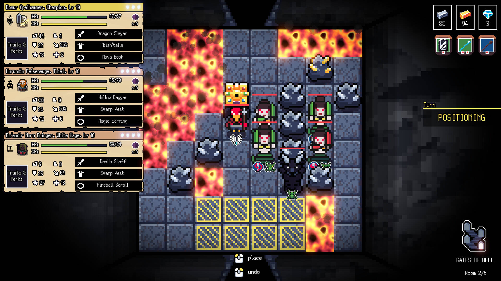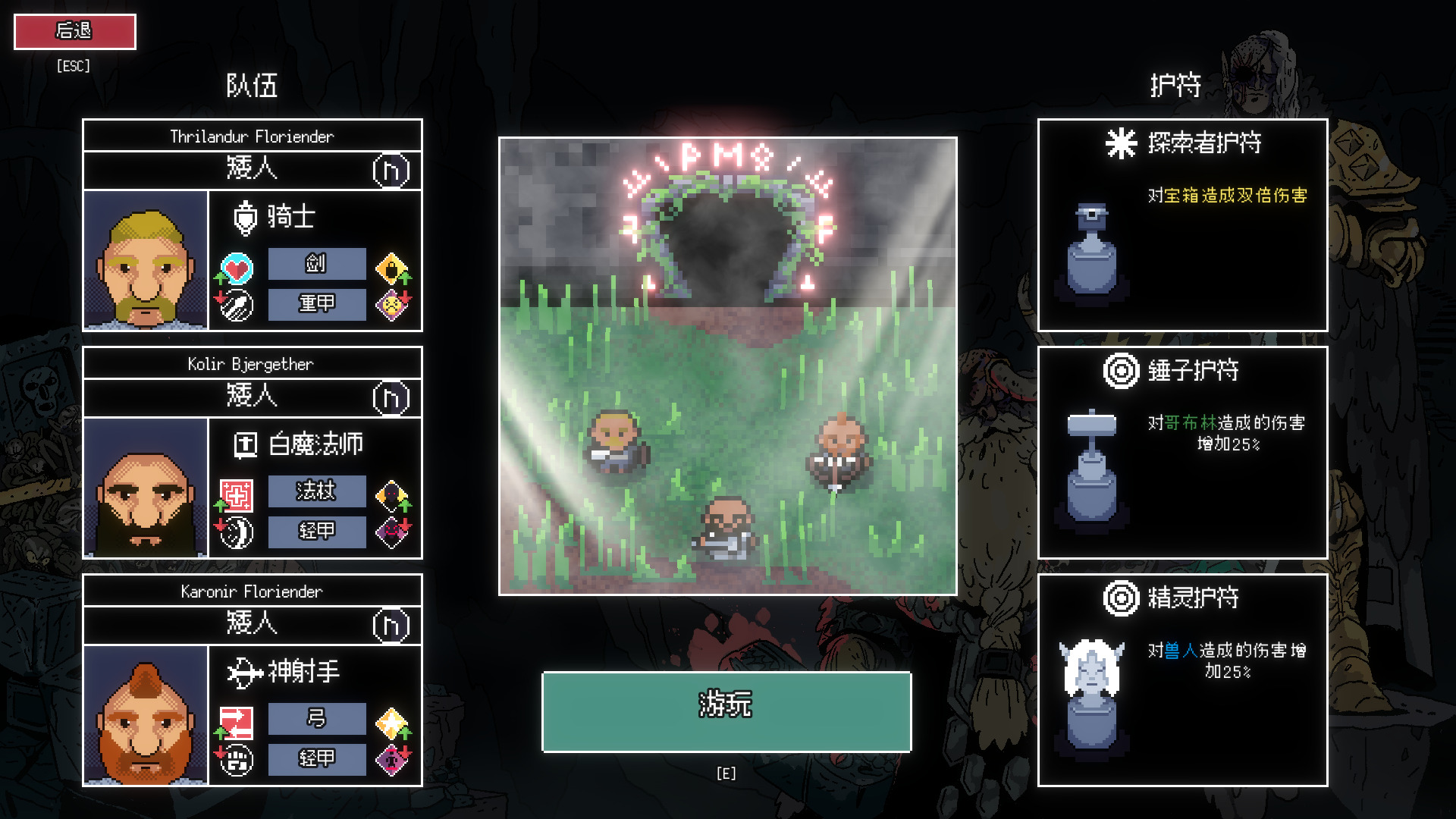 点击开始游戏后,选择3个职业和种族,搭配符文后就可以开始一场冒险,游戏共有4层,每层包含5个关卡,每层最后一关设有随机boss。普通关卡的回合限制为8回合,而boss战的回合限制为15回合。超过回合限制会有大量敌人增援,游戏初期很难击败这些增援。达到规定的回合数后,请尽快前往下一层。