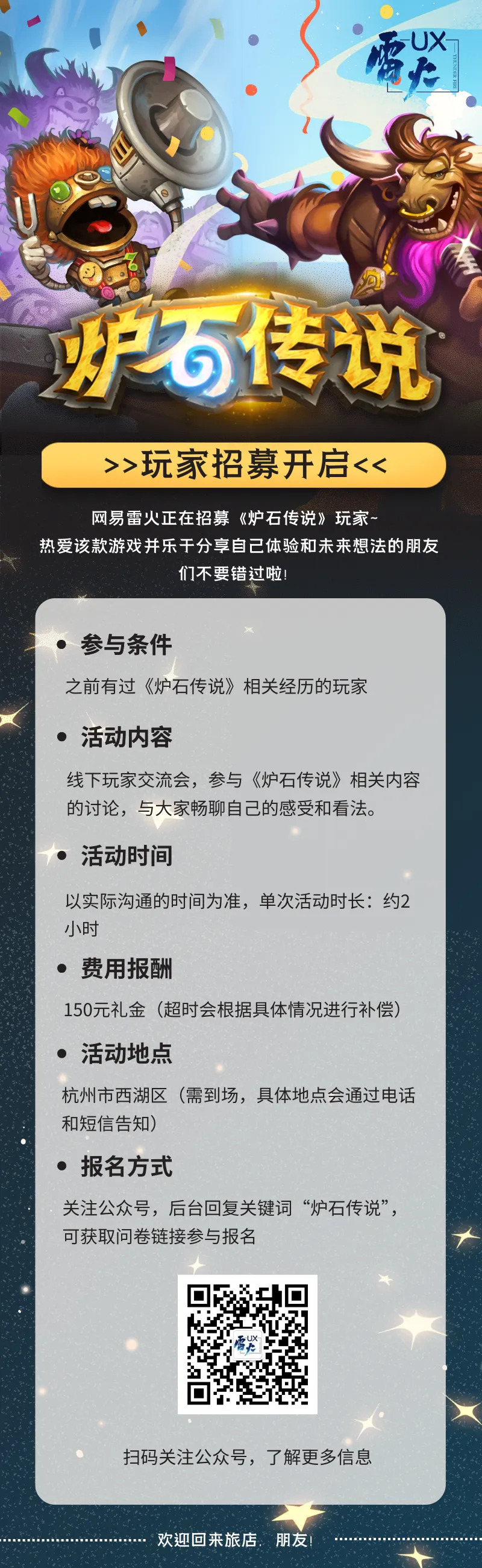 在国服回归官宣后,网易雷火已经陆续组织过魔兽世界和守望的线下玩家交流会,现在要轮到炉石了。今晚网易雷火微信公众号发布了一则玩家招募,按步骤获取问卷并报名。